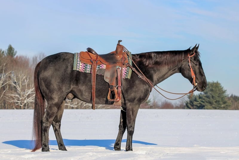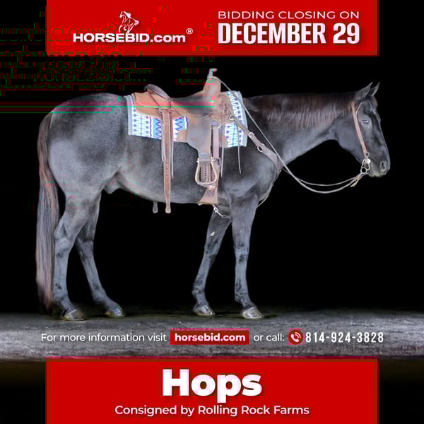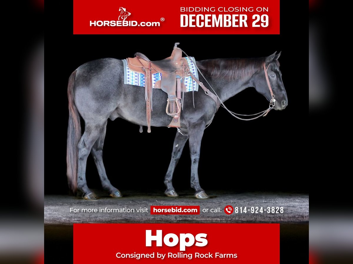 ⚜️𝐓𝐇𝐄 𝓗𝓮𝓻𝓲𝓽𝓪𝓰𝓮 𝐖𝐢𝐧𝐭𝐞𝐫 𝓒𝓵𝓪𝓼𝓼𝓲𝓬⚜️ Happening now thru MONDAY | DECEMBER 29th - Available EXCLUSIVELY on HorseBid's website! For more details and to register visit: www.Horsebid.com CONSIGNOR CONTACT: Rolling Rock Farms 814-924-3828 LOCATION: Miola, PA BREED: Quarter Horse REGISTERED: No COLOR: Blue Roan HEIGHT: 15.3 AGE: 13 GENDER: Gelding Hops is a 13 year old blue roan gelding standing 15.3 hands tall and is the kind of horse that is very hard to find. He is a true beginner friendly gelding that has been there and done it all, making him an ideal match for a wide range of riders, especially someone looking for safety, reliability, and consistency. He is an easy horse to ride and enjoy, whether you are riding occasionally or on a regular schedule. In the arena, Hops is extremely well broke and uncomplicated. He neck reins easily and will jog quietly on a loose rein or travel correctly with a headset when asked. His lope departures are simple and smooth off your outside leg, and he consistently picks up the correct lead. He maintains a steady rhythm, is easy to steer, and has a solid stop. He is not overly forward, which makes him comfortable for beginner and intermediate riders, but he is responsive when asked. On the trail, Hops is as dependable as they come. He is sure footed on different terrain and handles new environments with confidence. He will cross water, push through brush, step over logs, and ride out quietly alone or in a group. He is the type you can point down the trail and trust to take care of his rider, making him a great option for pleasure riding, camping trips, or someone wanting a safe horse outside the arena. Hops is also very easy to handle on the ground. He stands quietly to be saddled, bathed, and groomed, and is simple to manage for daily care. He does well whether kept in a stall or turned out on pasture and gets along well with other horses, staying in the middle to lower end of the pecking order. He is low maintenance and fits easily into most programs. Hops sells with a current negative Coggins, rabies vaccination, and was recently dewormed. He completed a wellness and lameness evaluation on 12/15/25. This is a solid, honest gelding that is ready to go to work or enjoy right away and would make a great addition to a family, lesson program, or private owner looking for a safe and steady partner. If you would like to check out Hops or have any questions please feel free to contact Ethan at (814) 924-3828