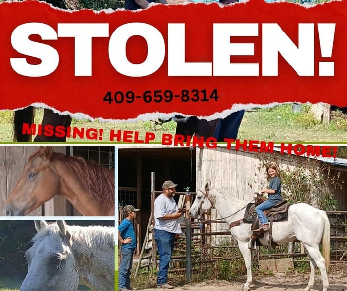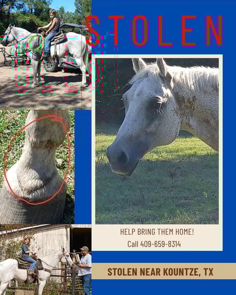 ‼️‼️STOLEN FM 943 KOUNTZE TX ‼️💔‼️HELP‼️‼️ Still Gone💔‼️ STOLEN 11-12/13 2025 after dark before 8 am on the 13th. Grey gelding with scars on foot and "bloody shoulder" mark on neck and ear. Sorrel Mare, sock on back foot, scar on chest, one scar knot on inside of leg, and on jaw. Please contact us immediately. Message or text 409 659 8314. Reward offered . Ford freestyle car, with clear title. ‼️‼️‼️💔Share please, post in groups, screenshot and send emails, send everywhere ‼️💔‼️💔 everything helps!!🖤