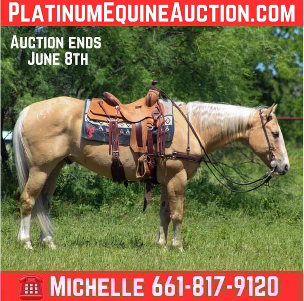ONLINE AUCTION Place your bids at www.PlatinumEquineAuction.com Starting Bid $3500 Auction ends June 8th, 2025 Need a new saddle? Check out White Rock Saddles on our website or Facebook! Meet Amigo, a fabulous 14-year-old Palomino gelding standing at a friendly 14.3 hands tall! They say blondes have more fun, and Amigo is living proof of that—this guy is an absolute blast to ride and be around! With years of experience under his belt, he’s done a little bit of everything, making him experienced. Don’t let his age fool you; Amigo is a seasoned veteran with plenty of pep in his step! He’s taken part in 4-H shows, both English and Western, and knows his way around the playday events. He’s even tackled cross rail jumps! Amigo is the kind of horse who will go wherever you point him, making him a true “point-and-go” buddy. He’s also been a reliable partner in moving cattle from pasture to pasture and has a lovely running walk that makes covering ground a breeze. Amigo has explored miles and miles of beautiful trails and has enjoyed weekend camping trips at various parks. He’s fearless when it comes to crossing logs, water, and bridges, and he confidently navigates through brush, all while keeping his cool around wildlife like foxes, deer, and elk. Amigo has a delightful short lope that’s just a joy to ride, whether you’re out on the trails or meandering through the pastures. In the arena, he’ll walk, trot, and lope circles with ease, always picking up the correct leads. His neck rein is fantastic, making him easy to handle. He’s friendly and easy to ride, which means you can enjoy every moment in the saddle! This wonderful gelding is great around dogs, kids, and other horses, making him the perfect addition to any family. He’s easy to tack up and bridle, stands patiently for the farrier, loads and unloads off the trailer without any fuss, and stands tied like a champ. If you’re looking for a fun, reliable, and experienced partner to share adventures with, Amigo is your guy! Come meet him and see for yourself just how special he is! If you can’t make it to see him that’s ok because we offer FaceTime showings. If you need help with transport don’t hesitate to ask we have a list of reputable haulers that can get him safely to your doorstep WORLD WIDE including, Alaska , Mexico, Hawaii, Canada and anywhere in between. Call M $ Performance Horses Michelle 661-817-9120 with any questions. Located in Stephenville, TX. ONLINE AUCTION Place your bids at www.PlatinumEquineAuction.com Starting Bid $3500 Auction ends June 8th, 2025 Need a new saddle? Check out White Rock Saddles on our website or Facebook!