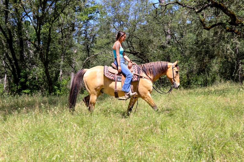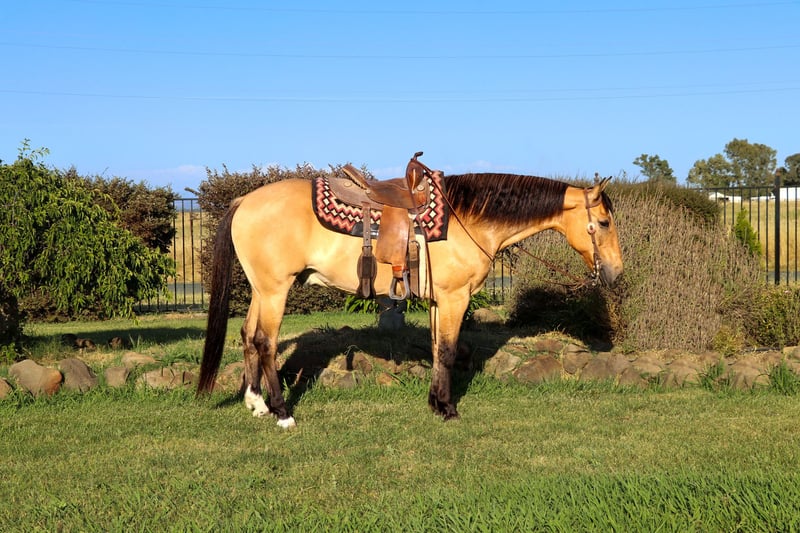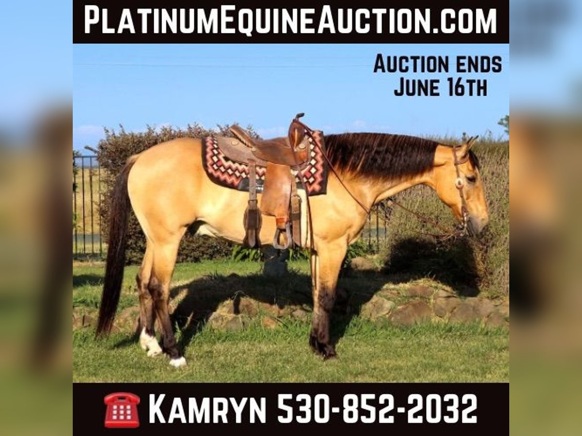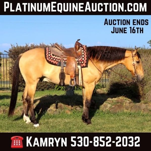 ONLINE AUCTION Place your bids at www.PlatinumEquineAuction.com Starting Bid $3500 Auction ends June 16th, 2024 Need a new saddle? Check out White Rock Saddles on our website or Facebook! Meet Akon a 13 year old 15 HH horse that turns heads and wins hearts. With his stunning buckskin coat that shines with a natural luster, Akon is the epitome of beauty and elegance. This exquisite horse is not just a pretty face. Akon is exceptional on the trails, tackling any terrain with confidence and ease. Whether it’s dense forests, rocky paths, or water crossings, Akon moves forward with determination and poise. His sure-footedness is comparable to a mountain goat, making him the perfect partner for adventurous trail rides. His extensive experience on the ranch has honed his skills, making him adept at gathering cattle even in the steepest and roughest country. In the arena, Akon is a sight to behold. He is fancy broke and knows his leads, offering a smooth, comfortable lope that is a joy to ride. His transitions are seamless, and his stops are sharp, responding directly to your seat. Akon collects his head beautifully and is light and responsive to both your hands and legs. He has also been started on barrels and poles, showing incredible potential to excel in these areas. Akon is the ultimate multi-tasker. One day he can take you on a leisurely trail ride, the next he can compete in a gymkhana, and then finish the day by gathering cows. His work ethic is unmatched; he goes all day long without a hint of quitting. Akon thrives on having a job and puts his heart into everything he does. Due to his responsiveness and quick-footed nature, Akon is best suited for an intermediate rider and up or a home with a trainer. His high level of training and sensitivity make him an exciting ride for those who can match his energy and skill. Akon is well-mannered and easy to handle. He stands patiently for saddling, bridling, bathing, grooming, blanketing, and the farrier. He loads effortlessly into a trailer, ready to go on any adventure. Akon can even be ridden bridleless and bareback, showcasing his versatility and solid training. If you’re looking for a horse that combines beauty, skill, and an incredible work ethic, Akon is the perfect choice. Don’t miss the chance to own this amazing buckskin gelding. He’s ready to be your next star, whether on the trail, in the arena, or working on the ranch. Experience the elegance, skill, and versatility of Akon firsthand. Arrange a visit today to meet Akon. Contact KW Ranch at 530-852-2032. ONLINE AUCTION Place your bids at www.PlatinumEquineAuction.com Starting Bid $3500 Auction ends June 16th, 2024 Need a new saddle? Check out White Rock Saddles on our website or Facebook!
