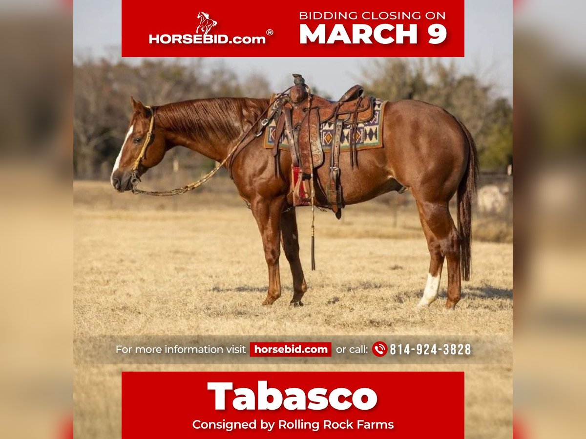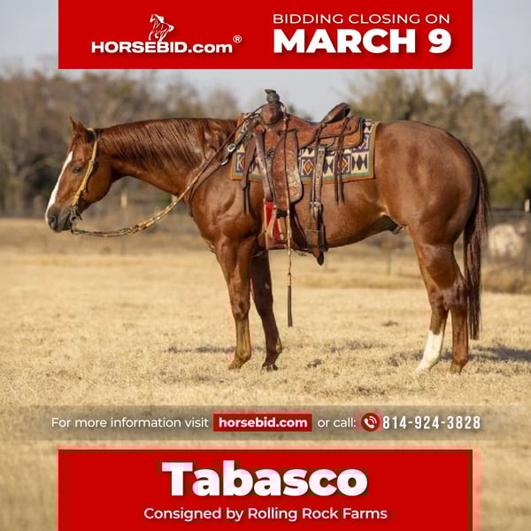ℳ𝒶𝓇𝒸𝒽 ♦️𝐑𝐈𝐃𝐄𝐑'𝐒 𝐂𝐇𝐎𝐈𝐂𝐄♦️ Happening now thru MONDAY | MARCH 9th - Available EXCLUSIVELY on HorseBid's website! For more details and to register visit: www.Horsebid.com CONSIGNOR CONTACT: Rolling Rock Farms 814-924-3828 LOCATION: Miola, PA BREED: Quarter Horse REGISTERED: Yes REGISTERED NAME: Elans Smoking Gun COLOR: Sorrel HEIGHT: 15.1 AGE: 15 GENDER: Gelding HighLight Alert Elans Smoking Gun or as we call him around the barn Tabasco is one of our all time favorite horses that we have offered for sale. Tabasco is a OWN SON OF THE FAMOUS COLONELS SMOKING GUN (Gunner) Hall of Famer and 15 Millon Dollar Sire! Tabasco is SUPER GOOD BROKE TO RIDE ALSO! He is a FINISHED REINER. Spins Each Way with your hands in the air and has nice sliding stops. Super Trained but best thing about him is anyone can ride him and he is not complicated to ride at all. A total beginner could ride him and withing 5 mins teach them to spin him. Hes super quiet and gentle and SAFE! Tabasco was bred and raised in Brazil and then sold to Teton Ridge in Texas for $ 125,000. He was used on a large ranch in Idaho . There is where he became a awesome trail horse and has had countless rides in the mountains. He is a great trail horse . Watch him ride in the water in our video on a 40 degree day he walked right in without hesitation. If you want a horse that you can just go out and ride like a regular horse he will ride like that or else you can take him and he will ride like a show horse. But after saying all this my favorite thing about Tabasco is how safe and gentle he is! He will be 15 years old on March 31st . He still has lots of life to him and is still in the prime of his life in my opinion. Whoever is the lucky winning bidder of Tabasco is getting a very special forever type horse.