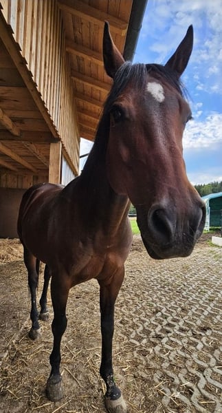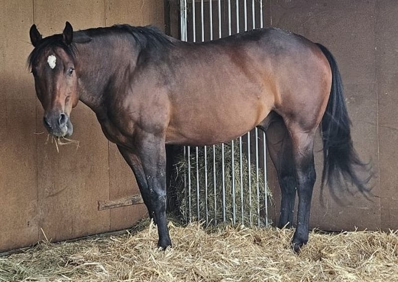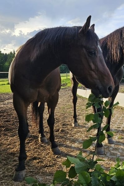 My horse Jamie is looking for a loving home. Beautiful 14-year-old bay Quarter Horse gelding, standing at 15.6 hh. Jamie has been registered with AQHA since 2014 and with DQHA since 2015, and has regularly competed at shows with his previous owners. He is friendly and people-oriented, enjoys moving in all gaits, and can even jump over fallen trees or poles at the riding arena. He also appreciates just going for walks. Until mid-2022, he was used as a school horse, ridden with professional partial training and physiotherapy, kept in a paddock with outdoor shelter. Since then, he has been living with Romeo at our home in an open stable with permanent turnout on 4,000 to 40,000 square meters, depending on weather conditions. He is calm when farrier work is done, relaxed during grooming and tacking. Grooming can also be done without being tied, as long as it’s within a fenced area. Not spooky, at home, on rides alone or in company, and during trailer loading. Open to new people and animals; here, he lives with dogs, cats, chickens, and cows (on the neighboring property). Since 2023, he has not been shod, as he mainly stays on pasture, but he also walks on roads or field paths without any issues. He is regularly dewormed and presented to the farrier. There are no signs of chronic illness or injuries. In summary, he has a remarkably calm character and is perfect for someone looking for a versatile, reliable, and friendly horse. Who is this horse suitable for? This wonderful partner is ideal for both beginners and experienced riders seeking a horse for sport disciplines and creative work. He is also excellent for families looking for a loyal and dependable mount. For more information or a personal conversation, I am happy to assist.