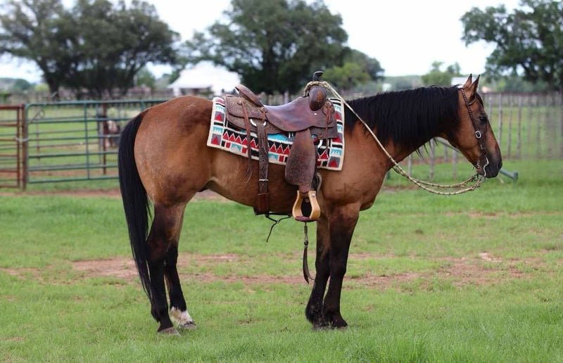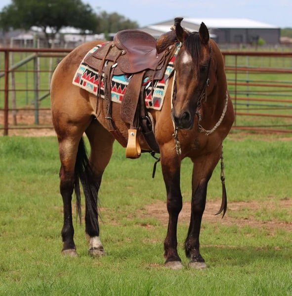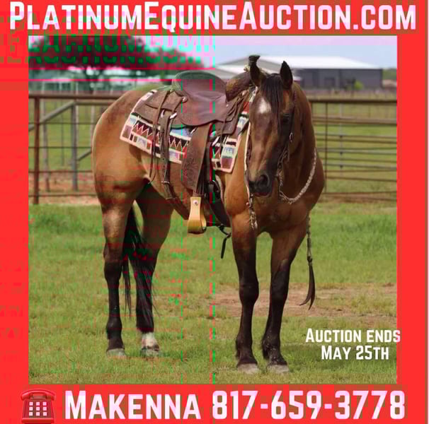 ONLINE AUCTION Place your bids at www.PlatinumEquineAuction.com Starting Bid $3500 Auction ends May 25th, 2025 Need a new saddle? Check out White Rock Saddles on our website or Facebook! Capper is finished on the heel side, great trail horse, and just an all around fun mare to have in the barn! He is 15 years old, grade and 14.3hh tall! Cap is very handy broke, has a nice turn around, big stop and super light in the face! He moves off your legs and lopes around smooth as butter right out of his tracks. He will carry flags, is good in traffic and on roads/highways. We hauled him to the famous Fort Worth Stockyards to ride him through the busy day downtown there and he didn’t ever have a care in the world, was just happy to be there! Capper is turned out with other mares and geldings, low on the pecking order and gets along with everyone. He also does very good stalled and eats and drinks well on the road. He stands to be saddled, stands good for the farrier and vet, and is easy to catch! He is UTD on everything and just had his teeth done. Capper is a clean slate ready for anyone to use! We are located in Lipan Texas and have hauling available anywhere in the U.S., Hawaii or Canada! Don’t miss out on the gorgeous buckskin gelding! Please call or text Makenna Hartzell 817-659-3778 with any questions. ONLINE AUCTION Place your bids at www.PlatinumEquineAuction.com Starting Bid $3500 Auction ends May 25th, 2025 Need a new saddle? Check out White Rock Saddles on our website or Facebook!