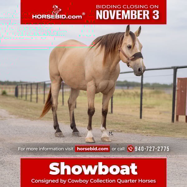 ⚜️𝐓𝐇𝐄 𝐅𝐀𝐋𝐋 𝐇𝐄𝐑𝐈𝐓𝐀𝐆𝐄 𝐂𝐋𝐀𝐒𝐒𝐈𝐂⚜️ Happening now thru MONDAY | NOVEMBER 3rd - Available EXCLUSIVELY on HorseBid's website! For more details and to register visit: www.Horsebid.com CONSIGNOR CONTACT: Cowboy Collection Quarter Horses 940-727-2775 LOCATION: Gainesville TX BREED: AQHA REGISTERED: Yes REGISTERED NAME: Who Dat Leo Twister COLOR: Buckskin HEIGHT: 15 AGE: 15 GENDER: Gelding "SHOWBOAT' is the ticket to a GREAT ride! Smooth traveling and responsive to rider cues. He has been pasture ridden as well as in the arena. He is calm and pretty. Good on trails. No soundness issues and good with the farrier. He loads, hauls, and is easy to catch. Watch the ENTIRE VIDEO to see him perform. Broke to the mounting block. He is good with other horses and is also fine in the stall. This pretty gelding will make you shine!! PPE welcome at buyers expense. Call Todd at (940) 727=2775 for more information.