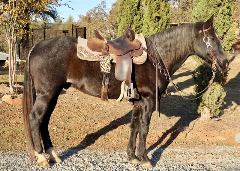 ONLINE AUCTION Place your bids at www.PlatinumEquineAuction.com Starting Bid $3500 Auction ends December 15th, 2024 Need a new saddle? Check out White Rock Saddles on our website or Facebook! Do you want an absolutely stunning gelding? Fancy broke and sure footed for some rough terrain? Captain is your man. He’s a stunning blue roan gelding, with an amazing mane and tail. He’s eye catching and kind! 14yo grade gelding. Standing about 15.1 and solid built. He’s got a fresh set of 4 shoes on him. Great with his feet, stands tied, easy to saddle, bridle, bathe, blanket, load and haul. Extremely quiet in the trailer. Load him up and get a bite to eat before going out in the rough terrain to gather some cattle. He was previously used on the ranch, he loves and seeks a job. He is not a slow poke around horse, however he is absolutely fun to ride and has slow smooth gaits. No mean bone in his body. No buck bolt rear. Cinch him up and get on. He’s fancy in the arena, collects up very pretty, nice stop, turn around, picks up his leads immediately. He’d make a jam up gymkhana horse he’s broke enough to just take out and do the patterns. I’ve taken him down extremely steep slippery rocky hills. He does not bat an eye. Not spooky. Really smooth gaits. Easy keeper no maintenance, no know injuries. No known health issues. I really enjoy riding this horse, I like my work horses. While he is forward anyone who confident enough to ask him what they want him to do can handle him. The video shows exactly what he is. He can be a bit barn sour if he’s next to a bunch of horses, it’s not horrible he’s not going to run you back, he’s not going to pull you out of the arena. If you confidently ask him to do what you want he will no hesitation do what’s asked. He’s been rode down the road by cars, bikes, flags, tractors, etc. He’ll work for you all day long while looking pretty and fancy doing it. Located in valley springs ca. Cross B Horses Breeanna 925-783-8655. ONLINE AUCTION Place your bids at www.PlatinumEquineAuction.com Starting Bid $3500 Auction ends December 15th, 2024 Need a new saddle? Check out White Rock Saddles on our website or Facebook!