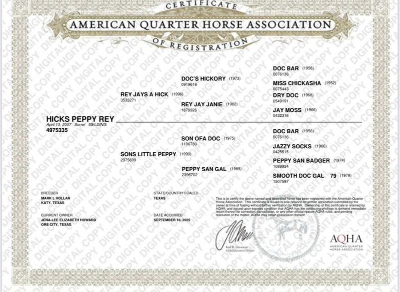ONLINE-AUKTION Bieten Sie jetzt unter www.PlatinumEquineAuction.com Startgebot: 3.500 USD Auktionsende: 14. Dezember 2025 Brauchen Sie einen neuen Sattel? Schauen Sie bei White Rock Saddles auf unserer Website oder Facebook vorbei. „HICKS PEPPY REY“ Dieser liebevolle Wallach ist perfekt für einen jungen Reiter oder Anfänger, der die Grundlagen des Sortierens erlernen möchte. Mit seinem ruhigen und sanften Wesen bringt er Ihrem kleinen Cowboy oder Ihrer kleinen Cowgirl im Handumdrehen die Tricks des Reitens bei! ❤️ – Steht hervorragend für den Hufschmied – Liebt Wasserbäder und Verwöhnmomente (ja, er genießt sogar eine ordentliche Blasgebläse-Behandlung 🐴💨) – Wettkampfteilnahmen im Sorting? Er besitzt die nötigen Fähigkeiten und Erfahrungen, um Sie beim Einstieg zu unterstützen! – Gelassen und geduldig, ideal als Lehrpferd für neue Reiter – Verfügt über eine beeindruckende Abstammung, mit Doc’s Hickory (Nachkommen mit Einnahmen über 19 Mio. USD) und Peppy San Badger (Nachkommen mit Einnahmen über 121 Mio. USD) in seiner Abstammung! Wenn Sie nach einem zuverlässigen und liebevollen Pferd suchen, das Ihre Familie bereichert, ist Cowboy die perfekte Wahl! Für weitere Informationen wenden Sie sich bitte an Tee bei 21H Versatility Horses, 970-275-9236. Standort: Ore City, TX.