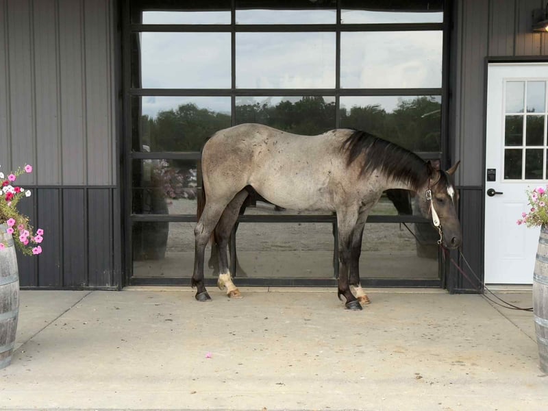 Sunny Blue Day “Chevy” is a 2023 model, reg AQHA, Blue Roan, Stud Colt, that is currently 15HH and will mature to 15.2HH+. Looking for a young, flashy prospect with a head start and a rock-solid foundation? Meet Chevy, a 2-year-old blue roan stud colt with the mind, manners, and movement to go in any direction you want. This colt has been started right—slow, consistent, and with a focus on building confidence, softness, and responsiveness. He was trained using the Downunder Horsemanship Method and has completed both the Fundamental and Intermediate levels and is working on skills in the Advanced Series. He yields his hind end and forequarters easily, sends through small passage and doorways, neck reins with the slightest touch, and flexes his neck softly all while maintaining a supple mouth. Chevy has riding experience in both English and Western disciplines. He has breezed the barrel pattern, exposed to cattle, taken for trail rides, and even been used for lessons with young students! He handles work like an old pro by staying cool, calm and collected during any task. He can handle animals running around, children, traffic, heavy machinery or any loud noises, as he is desensitized the very best. Chevy has the basics of the sought after sliding stop by relying on his hind end to get under him. He rides off of seat pressure, side passes, and has the beginnings of a nice spin. Not only can he do all of those tasks tacked, he can even do them bareback AND bridleless! Chevy’s demeanor is unparalleled for that of your typical stud colt. He is a gentlemen both under saddle and on the ground. He has a heart of gold and is a total sweetheart to anyone. He can be pastured with other studs, mares, and geldings alike. He always finds himself one of the favorites. He is relaxed, slow, and confident. He will ground tie during tacking and untacking, stands tied for hours without fuss, will meet you at the gate (even with a halter in your hand), loads…. Can’t say enough good things about this gentleman! This guy is the real deal! For more info contact Janelle with JR Ranch 319-325-6712. Located in Selma, IA.