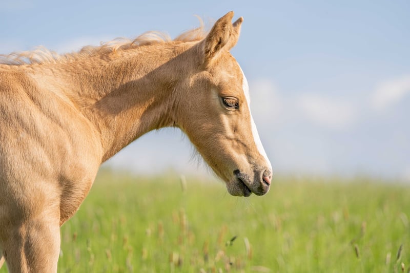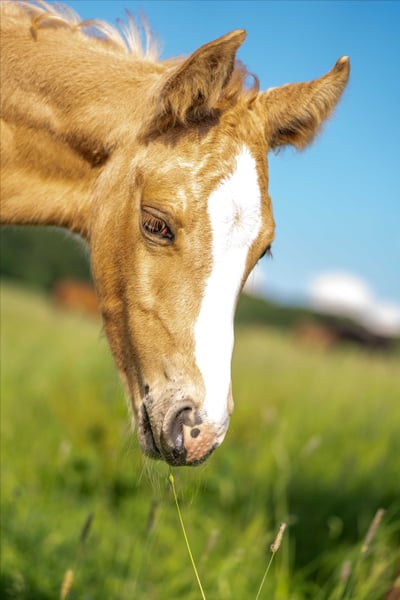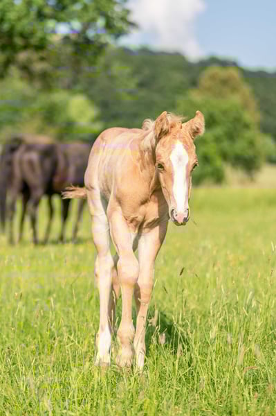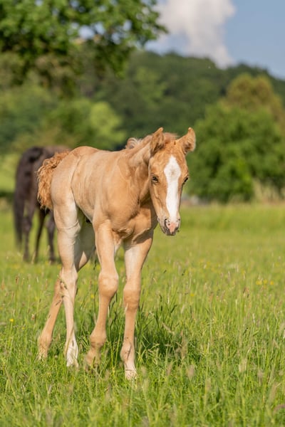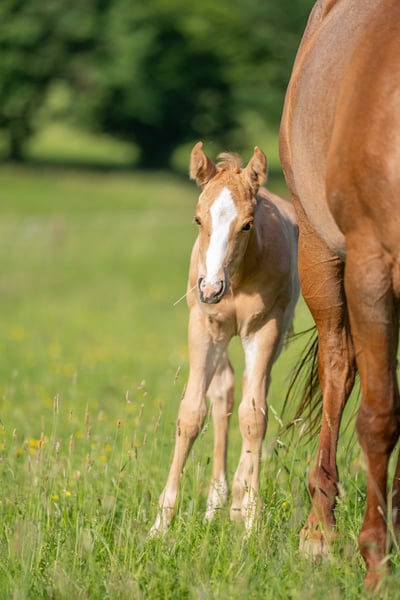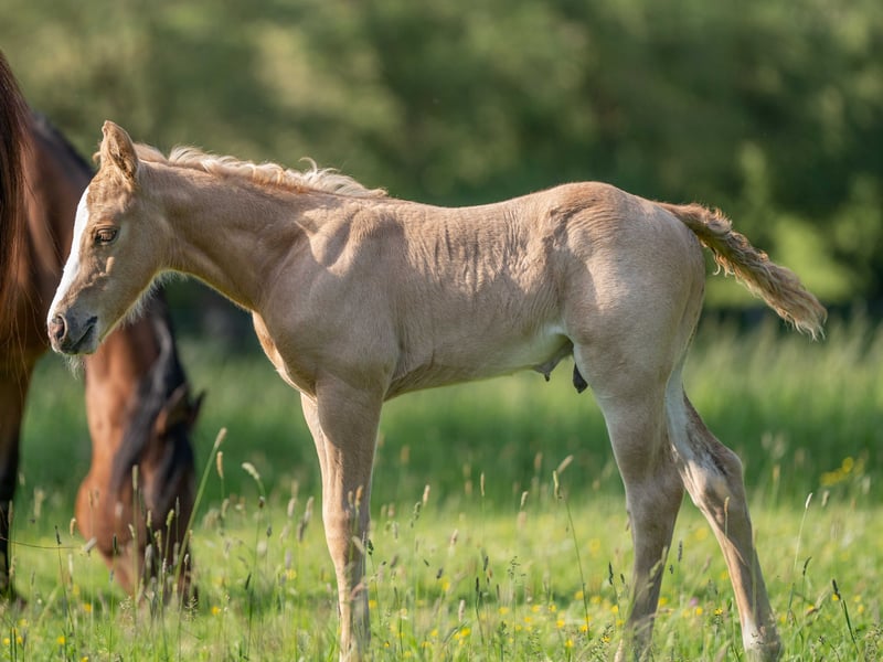 Strong and extremely correct young Quarter Horse colt in a very rare color. Spooky is Palomino and carries a roan gene. He also has green eyes (due to the Pearl gene). He is a very curious foal, people-oriented with a friendly character. He grows up with other mares and foals and is excellently socialized. He has already learned the basics of foal training, i.e. touching everywhere, haltering, lifting legs etc. It goes without saying that our foals are wormed regularly, have already been chipped and receive their AQHA pedigree certificate and DQHA equine passport. If desired, he can continue to be raised by us or move to a new home from around October. Spooky would be delighted to receive a visit. Please contact us.