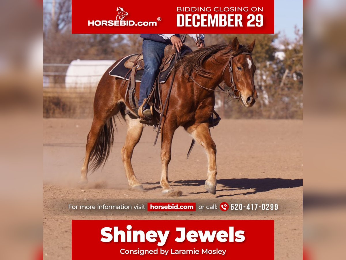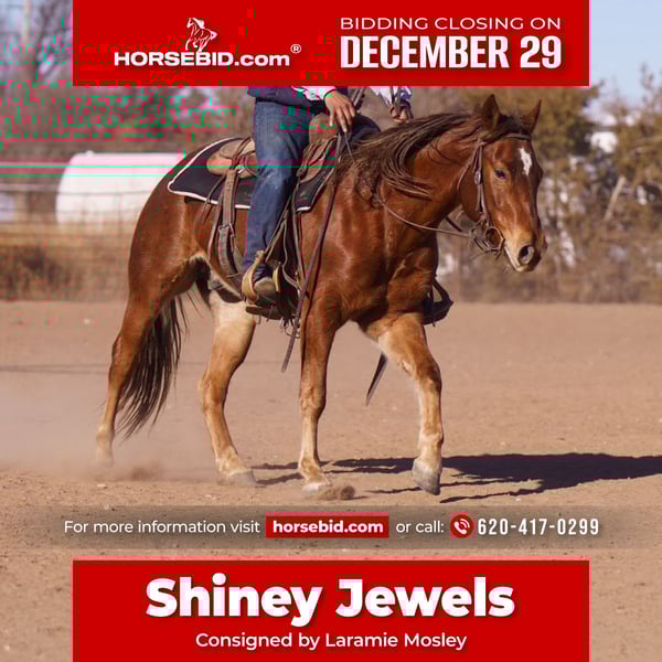 ⚜️ 𝓗𝓮𝓻𝓲𝓽𝓪𝓰𝓮 𝐖𝐢𝐧𝐭𝐞𝐫 𝓒𝓵𝓪𝓼𝓼𝓲𝓬⚜️ Happening now thru MONDAY | DECEMBER 29th - Available EXCLUSIVELY on HorseBid's website! For more details and to register visit: www.Horsebid.com CONSIGNOR CONTACT: Laramie Mosley 620-417-0299 LOCATION: Canyon, TX BREED: Quarter REGISTERED: Yes REGISTERED NAME: Shiney Jewels COLOR: Sorrel HEIGHT: 14.2 AGE: 2 GENDER: Gelding This Shiny Jewels colt is a sharp, talented young horse that came out of a reining program with a rock-solid foundation and a great start the right way. He’s an old soul type — always saddles up gentle, comes out the same every day, and tries hard to learn without ever acting young or silly. He’s super good-minded, strong, and athletic. He circles beautifully, stays balanced and cadenced, is a good stopper, and is starting to turn nice, showing all the makings of a very correct and competitive horse as he continues to mature. Soft, willing, and easy to progress. Outside the arena, he’s been used to prowl cattle, has been roped on and doctored outside, and handles real ranch work with confidence. He doesn’t spook, overreact, or get rattled — just stays level-headed and honest. Sired by Spooks N Jewels, Fappani’s $200,000+ NRHA earner, by Smart Spook and out of Whiz Jewels. Out of Miss Shiney Angel, by Wimpys Red Berry (Wimpys Little Step) and out of Miss Rey O Shine. A stacked pedigree known for trainability, stopping ability, and longevity. With his old-soul mind, strong foundation, and proven bloodlines, this colt has a bright future in any direction — reining, ranch versatility, or rope horse development. Well started, good-minded, and royally bred — a young horse with serious upside.