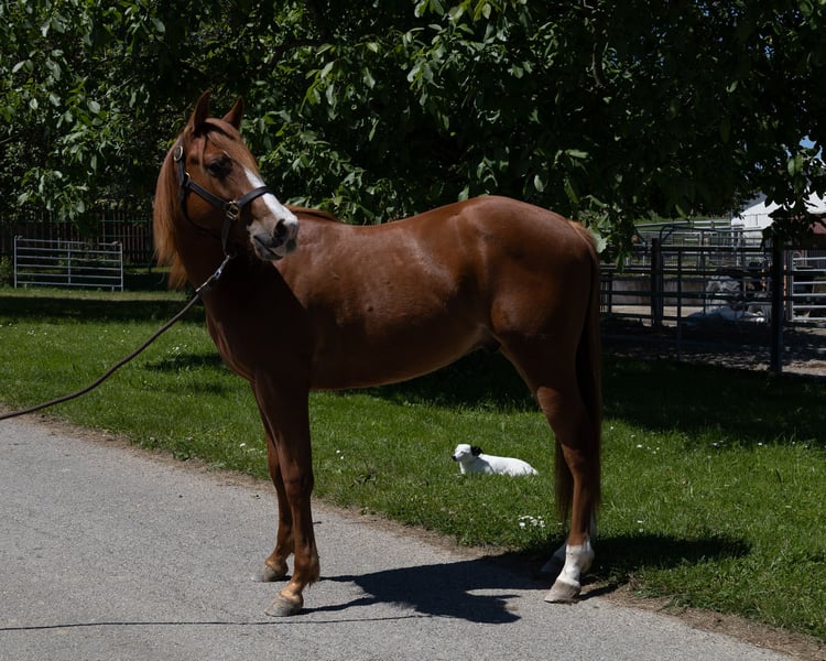 In vendita (per conto di) questo bel puledro castrato QH di 2 anni "RN DIAMOND JOY", soprannominato "Diamond". Attualmente ha un'altezza al garrese di 147 cm e sicuramente crescerà ancora. Le lunghe gambe lo indicano già! Ha movimenti molto belli, è agile e già ora si presenta molto equilibrato al trotto e al galoppo per la sua età. Cammina naturalmente scalzo e attualmente sta imparando l'ABC dei puledri/giovani cavalli. Conosce: - Stare legato - Dare i piedi - Fare la doccia - Essere spazzolato - Sella - Lavoro a terra - Passeggiate - Andare in escursione come cavallo da mano - Maniscalco È molto affettuoso e ha una grande voglia di compiacere. È disponibile per la visione e sicuramente diventerà un partner molto affidabile, sia per lo sport che per il tempo libero. Ha documenti AQHA, test a 7 pannelli e un passaporto equino. Video di lui in movimento possono essere inviati su richiesta.