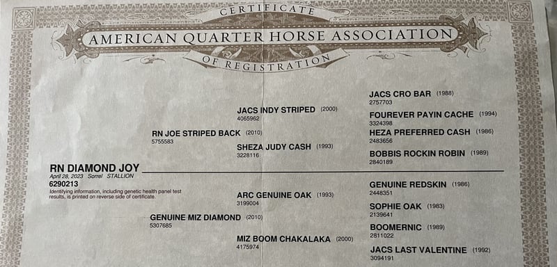 Te koop (op opdracht) staat deze knappe, 2 jaar oude Quarter Horse ruin „RN DIAMOND JOY“, bij ons bekend onder de roepnaam „Diamond“. Hij heeft momenteel een stokmaat van 147 cm en zal waarschijnlijk nog groeien. Zijn lange benen wijzen daar nu al op! Hij beschikt over zeer mooie bewegingen, is snel en toont nu al in draf en galop een goede balans voor zijn leeftijd. Hij loopt natuurlijk barhuf en mag bij ons net het veulen/jongpaarden ABC leren. Hij kent: - Aan de longeerstand - Hoefijzers geven - Afspoelen - Poetsen - Zadel - Bodemwerk - Wandelen - Als handpaard in het terrein - Hoefsmid Hij is zeer vriendelijk in de omgang en heeft een enorme wil tot willen leren. Hij staat klaar voor bezichtiging en zal zeker een zeer betrouwbare partner worden, of het nu voor sport of recreatie is. Hij beschikt over AQHA-papieren, een 7-paneltest en een paardenpaspoort. Video’s van hem in beweging kunnen graag worden toegestuurd.