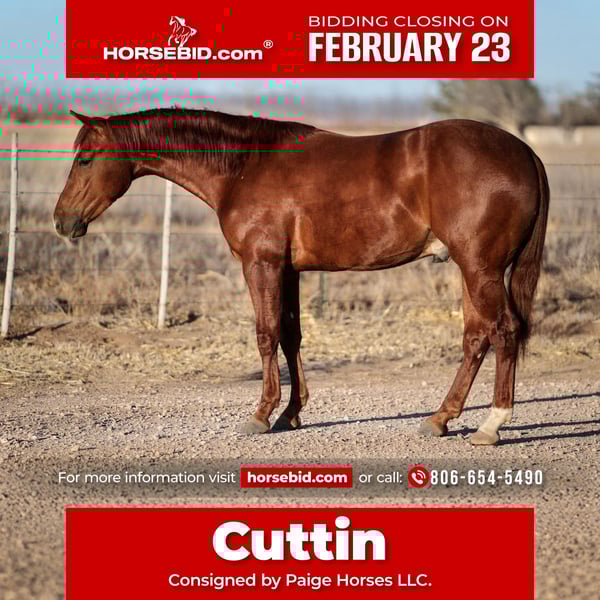💎 𝐓𝐇𝐄 𝓓𝓲𝓪𝓶𝓸𝓷𝓭 𝐒𝐇𝐎𝐖𝐂𝐀𝐒𝐄 💎 Happening now thru MONDAY | FEBRUARY 23rd - Available EXCLUSIVELY on HorseBid's website! For more details and to register visit: www.Horsebid.com CONSIGNOR CONTACT: Paige Horses LLC. 806-654-5490 LOCATION: Amarillo, TX BREED: Quarter Horse REGISTERED: Yes REGISTERED NAME: Gracious Cuttin Cat COLOR: Sorrel HEIGHT: 14.3 AGE: 3 GENDER: Gelding Like your favorite pair of scissors, you’ll get stuff done when you’re riding one like CUTTIN! Rope horse guys, sorters, calf/breakawayer’s, ranching guys, any and everybody will have a bright future with this one. Cuttin has spent a full year in a phenomenal cutting program and can easily go right back into one to be finished! Since we’ve had him he’s been used in the feedyard a little and he took it all with a great attitude. This gelding has the smoothest way of traveling I’ve ever rode. Low headed, loads up on his hocks, lopes like a rocking chair, and to top it all off, LOVES people. It’s not an accident why Cuttin has “the stuff”, his pedigree is stacked top to bottom with winners! Cuttin’s sire “SIR LONG LEGS” SIR LONG LEGS is an NCHA earner of $404,000: with accolades including but not limited to-NCHA Hall Of Fame; 2016 NCHA Open Futurity Reserve Champion; 2017 NCHA Open Derby Champion. Cuttin’s dam “Gracious Little Lena” is the dam of 3 AQHA foals age 3 & over, includina-Boon Blue Lena JMR (g. by Once In A Blu Boon). $6,315: 5th Arbuckle Mountain Limited Open Classic, Outback Cutting April Day 2 Int. Open Derby Champion. Cuttin had no choice other than to hit the ground watching a cow. He has all the size, substance, foot, bone, and mind to make a BIG TIME rope horse. Cuttin has a natural stop, great set of withers, cinches up deep, and is straight and correct in every way. Not one hair out of place and is guaranteed 100% sound in every way. We’ve gave him weeks off at times and he always tacks up gentle and ready to tackle whatever tasks we lay in front of him. He stands 14.3 hands tall and weighs a full 1175 lbs. Cuttin is located in Amarillo, Tx and we can help arrange hauling anywhere across the US. Feel free to call Taylor at 806-654-5490 for more information or to schedule a day to come try him. You’ll like this one whatever way you choose to finish him.