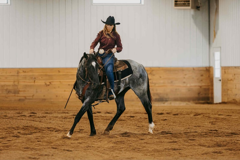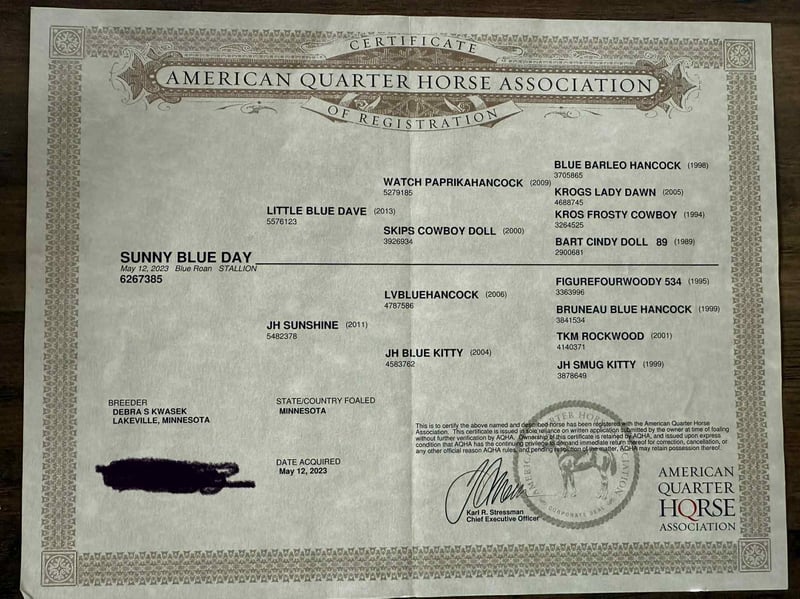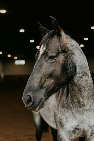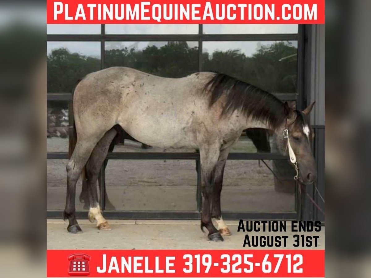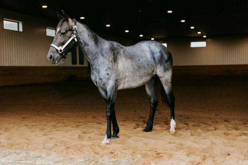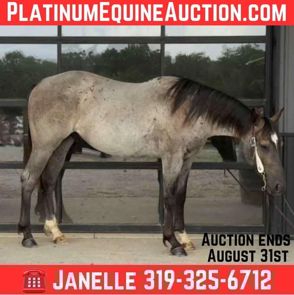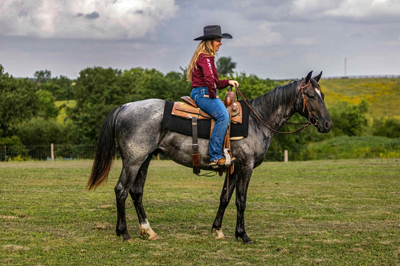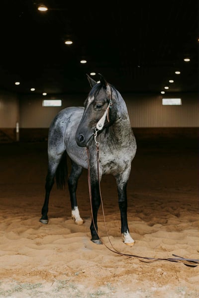 Sunny Blue Day “Chevy” is a 2023 model, reg AQHA, Blue Roan, Stud Colt, that is currently 15HH and will mature to 15.2HH+. Looking for a young, flashy prospect with a head start and a rock-solid foundation? Meet Chevy, a 2-year-old blue roan stud colt with the mind, manners, and movement to go in any direction you want. This colt has been started right—slow, consistent, and with a focus on building confidence, softness, and responsiveness. He was trained using the Downunder Horsemanship Method and has completed both the Fundamental and Intermediate levels and is working on skills in the Advanced Series. He yields his hind end and forequarters easily, sends through small passage and doorways, neck reins with the slightest touch, and flexes his neck softly all while maintaining a supple mouth. Chevy has riding experience in both English and Western disciplines. He has breezed the barrel pattern, exposed to cattle, taken for trail rides, and even been used for lessons with young students! He handles work like an old pro by staying cool, calm and collected during any task. He can handle animals running around, children, traffic, heavy machinery or any loud noises, as he is desensitized the very best. Chevy has the basics of the sought after sliding stop by relying on his hind end to get under him. He rides off of seat pressure, side passes, and has the beginnings of a nice spin. Not only can he do all of those tasks tacked, he can even do them bareback AND bridleless! Chevy’s demeanor is unparalleled for that of your typical stud colt. He is a gentlemen both under saddle and on the ground. He has a heart of gold and is a total sweetheart to anyone. He can be pastured with other studs, mares, and geldings alike. He always finds himself one of the favorites. He is relaxed, slow, and confident. He will ground tie during tacking and untacking, stands tied for hours without fuss, will meet you at the gate (even with a halter in your hand), loads…. Can’t say enough good things about this gentleman! This guy is the real deal! For more info contact Janelle with JR Ranch 319-325-6712. Located in Selma, IA.