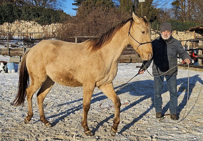 Ivo è un giovane stallone espressivo che è stato curioso fin dal primo giorno. Diventerà un partner molto affidabile per la vita per l'ambizioso ciclista amatoriale o agonistico. Viene accuratamente preparato da noi per la sua vita futura con i metodi dell'Equitazione Naturale. Si gode la sua vita in un alloggio aperto su un grande pascolo in una mandria mista. Sulla nostra pagina http://pferdezucht-maxen.de/Ivo-Dunit-Maxen/ sotto il pulsante "Registro di allenamento" troverai lo stato attuale dell'allenamento.