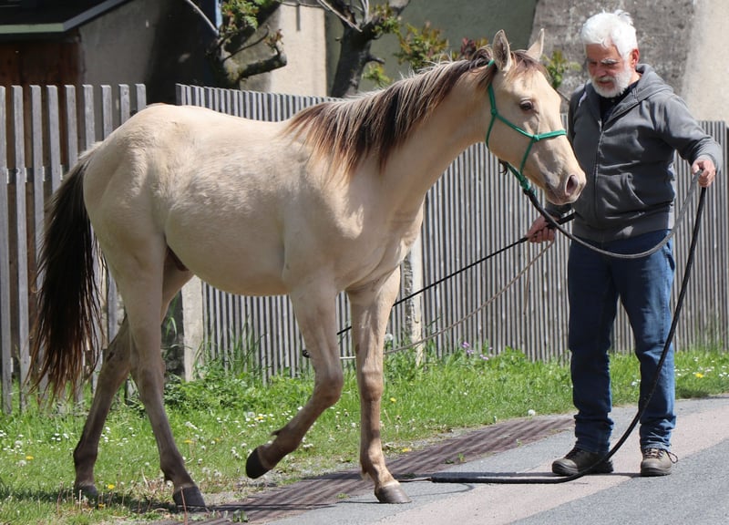 Ivo is an expressive young stallion who has been curious since day one. It will become a very reliable partner for life for the ambitious recreational or tournament rider. He is carefully prepared by us for his future life with the methods of Natural Horsemanship. He enjoys his life in open stables on a large pasture in a mixed herd. On our page http://pferdezucht-maxen.de/Ivo-Dunit-Maxen/ under the button "Training protocol" you will find the current training status.