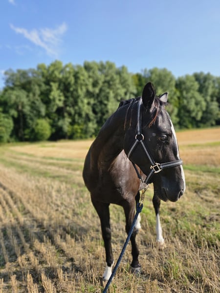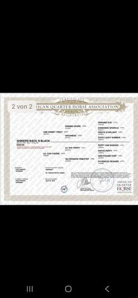 SHINERS BACK N BLACK Rufname: Duke AQHA- & DQHA-registrierter Wallach | geboren April 2023 | NN6 Mit SHINERS BACK N BLACK, Rufname Duke, bieten wir einen jungen American Quarter Horse Wallach an, geboren im April 2023 in Deutschland, der durch seine Abstammung, seine Einstellung und seinen Arbeitswillen überzeugt. Er ist AQHA-registriert, bei der DQHA geführt und wurde auf der DQHA-Zuchtschau vorgestellt, wo er eine Gesamtbewertung von 83,52 Punkten erhielt. 🔹 Abstammung Vater: ONE SHINEY TREAT Mutter: LIL COW PADDIE Weitere in den Papieren geführte Vorfahren sind u. a.: SHINING SPARK, GENUINE DOC, DIAMONDS SPARKLE, DOCS LUCKY NUMBER, PEPPY SAN BADGER, GREYHOUND STEP, PATIENCES REWARD. 🔹 Genetik NN6 (Six Panel negativ) getestet frei von HYPP, HERDA, GBED, PSSM1, MH und IMM 🔹 Charakter & Umgang Duke zeigt sich als: motiviert arbeitswillig aufmerksam gelehrig mit deutlich erkennbarer Freude an Arbeit und Beschäftigung Im täglichen Umgang ist er: halfterführig verladefromm schmiedefromm an viele Außeneinflüsse gewöhnt, darunter Hunde, Autos, Traktoren sowie allgemeiner Stall- und Hofbetrieb Duke bringt viel Motivation und Potenzial mit und möchte gefördert und beschäftigt werden. Wir wünschen uns daher bewusst erfahrene Hände, die Freude daran haben, mit einem jungen, arbeitsfreudigen Pferd weiterzuarbeiten und sein Potenzial weiterzuentwickeln. Wir kauften ihn zusammen mit seinem Halb-)Bruder, damit der Bruder in unserer kleinen Gruppe nicht als einziges Jungpferd steht. Von Beginn an war klar, dass wir ihn nicht behalten. Er kennt somit andere Pferde (jung und alt) und kann problemlos in eine Gruppe integriert werden. Wobei sich schon abzeichnet, dass er nicht zu den rangniedrigen gehört. 🔹 Eckdaten Name: SHINERS BACK N BLACK Rufname: Duke Geschlecht: Wallach Geburtsmonat: April 2023 Zuchtland: Deutschland Züchter: Iver Hansen Papiere: AQHA Certificate of Registration & DQHA-Unterlagen vorhanden 📍 Standort: Deutschland 📄 Originalpapiere vorhanden 📩 Weitere Informationen auf Anfrage