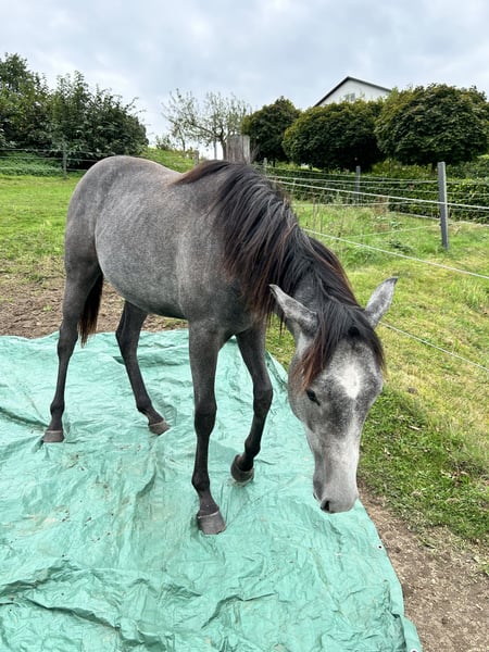Verkaufe einen vielversprechenden American Quarter Horse Wallach, geboren im Jahr 2023. Der elegante Schimmel überzeugt durch sein freundliches Wesen und seine beeindruckende Konstitution. Mit einem Stockmaß von ca. 160 cm ist er perfekt für den Westernreiten-Sport geeignet und zeigt bereits jetzt großes Potenzial in diesem Bereich. Der junge Wallach ist gut erzogen und zeigt sich im Umgang äußerst angenehm. Seine robuste Statur und sein ausgeglichener Charakter machen ihn zu einem idealen Partner für ambitionierte Reiter, die einen zuverlässigen und lernfreudigen Quarter Horse suchen. Dieser vielversprechende Nachwuchs ist bereit, seine Ausbildung weiterzuführen und sich in der Westernwelt zu beweisen. Er ist noch nicht angeritten!