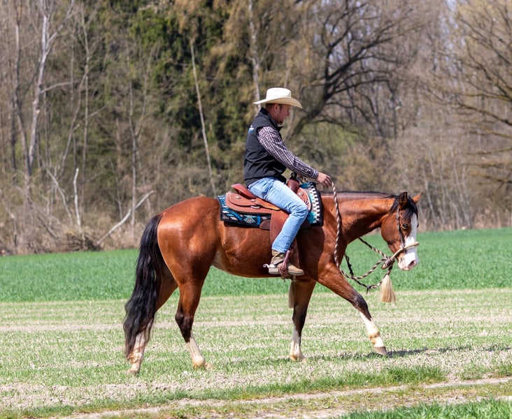 We are offering our beloved American Quarter Horse gelding, "Johnny," born in 2023, in the stunning color "Bay." This young gelding impresses with his promising pedigree and exceptional talent in the reining discipline. He has been backed and demonstrates a strong willingness to learn, along with a solid foundation in basic training. With his correct conformation and elegant appearance, he is truly a head-turner. A horse with great potential that still needs further development and support. Johnny was born here and raised in a large herd. He is familiar with the lively life on a horse farm, including tractors, cattle, and children. Please contact us by phone only at 0172/9084423 for inquiries.