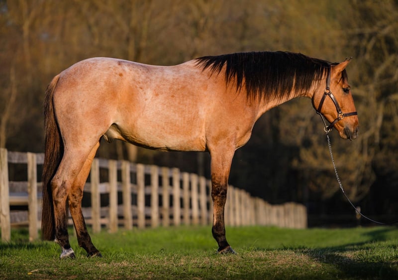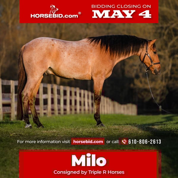 ▪️▫️◾️𝐭𝐡𝐞 𝑴𝒂𝒚 𝐒𝐞𝐥𝐞𝐜𝐭◾️▫️▪️ Happening now thru MONDAY | MAY 4th - Available EXCLUSIVELY on HorseBid's website! For more details and to register visit: www.Horsebid.com CONSIGNOR CONTACT: Triple R Horses 610-806-2613 LOCATION: New Holland, PA BREED: Quarter Horse REGISTERED: No REGISTERED NAME: Milo COLOR: Bay Dun Roan HEIGHT: 15.3 AGE: 3 GENDER: Gelding “Milo” is a three year old, 15.3hh, QH gelding, with a beautiful bay-dun, roan coat. This sweet boy has an old soul. He is the best minded youngster!!! If you are looking for something younger, yet reliable, safe, and the same horse every ride, here is your boy. Not to mention he is sweet, and has a fun, goofy personality! Milo is very mature for his age, and an honest all around horse. In the barn, Milo has zero bad habits. He can live in, or out, gets along great with a mixed herd and he is easy to catch. He stands on the cross ties to be groomed, tacked, bathed, etc. He is gentle and safe to work around, and safe for kids and beginners to work with. He is very in your pocket and can be a silly boy, he has lots of personality and guaranteed to make you laugh. He has no stall vices and doesn’t complain. He doesn’t mind my dogs running all around his feet and playing in the barn alley. Milo has great ground manners, and he is very respectful. He is good for the vet and farrier as well. He has a very gentle, calm demeanor and would make a great family horse. On the trails, Milo is a total babysitter and takes good care of his rider. He will lead, follow, go out in groups and alone. He is not spooky, and will follow right along with the group on a loose rein. Or ask him to take the lead and he will do so willingly. Milo crosses water, loves to play and splash in the lakes, and enjoys swimming. He crosses logs, rocks, bridges, and other trail obstacles. Milo is safe with traffic, bikes, dogs, you name it. He is the type of horse that you can throw your husband on and let him just follow along. Milo will happily move out when asked, lope across wide open fields on the buckle and then drop right back down to a gentle walk. He absolutely loves trails, and he is the same horse off property. He loads and trailers like a gentleman and ties to the trailer to get ready. Milo is always up for a fun adventure, he will keep you safe, and put a smile on your face! Take him camping, fox hunting, to hunter paces, etc, he is ready to be your partner through it all! Milo rides western, english, and bareback. He has extra comfortable gaits, with a rocking horse lope, and smooth trot. He is easy going under saddle and the same horse every time, whether he sits for weeks or not. You don’t need to lunge and he doesn’t need to be in a routine. Milo is at a really great spot in his training for his age. He has not been pushed, and he is currently set up to head in any direction. Milo is knowledgeable, yet not “finished” in any certain discipline. He is one of those types of horses that was simply just “born broke”. Smart, easy to teach, and takes everything in stride. In the ring, Milo will walk, jog, trot, lope, canter, and rides in a snaffle. You can ride him in a halter and lead rope, and I have even played around with just a neck rope. He is very soft in your hands and listens well to voice commands. Milo knows his leads, and is learning about lead changes. He will move laterally off of your leg, side pass, pivot, back up, neck rein, and has a great whoa button. His gaits are adjustable, and his transitions are very smooth. Ride him collected or on the buckle. Milo will lope off from a walk, and he has one of the most comfortable canters I have ever felt. He will happily trot ground poles, and he has walked over cross rails. I have not jumped him due to his age, but he is brave and honest with everything that I ask of him. Milo has had an easy start to life, and he is the second horse that I have purchased from this trainer, and he does a fabulous job with these horses. Milo is currently set up to head into any direction. He shows potential in many different disciplines. Not every three year has a brain like Milo. I feel confident throwing beginners on him, knowing that he will take care of his rider. He is very well rounded and has been exposed to a lot for his age. Milo is going to grow into one heck of a horse. With his uphill build, beautiful conformation, and pretty head, this boy has a bright future in every direction. Whether he is a trail horse or goes into the show world, he is happy and willing to do it all. If all young horses had a brain like Milo, there wouldn’t be a need for horse trainers(lol). Here is your opportunity to own a very nice, young, safe gelding. Milo is a very easy keeper with zero maintenance. Simple diet. He is good for the vet and farrier, and can go barefoot or wear shoes. He currently has front shoes for trail riding. He has nice, large, solid hooves. Milo does not have any health or soundness issues. He is very low key, and super easy to have around. Please feel free to reach out for any further information!! Shipping can be arranged anywhere!