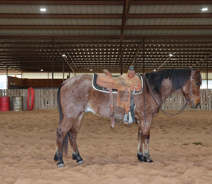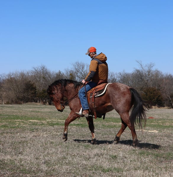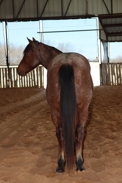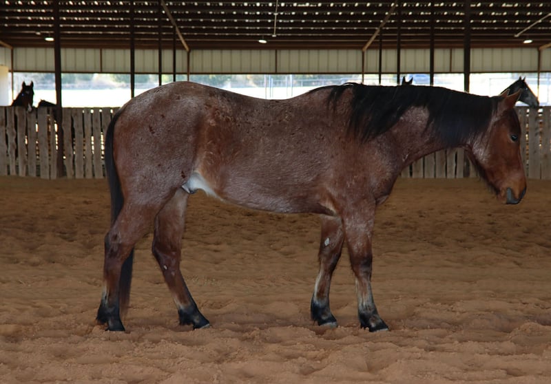 "AVAILABLE ON ONLINE HORSE AUCTION AT www DOT PlatinumEquineAuction DOT com BIDDING OPEN NOW thru SUNDAY | MARCH 8TH! *Final price will be determined on auction site* CONSIGNOR CONTACT INFO: Marco Roux Performance Horses 918-910-1197 LOCATION: Holdenville, OK Bay Roan Gelding 3year old coming 4 stand 14 hands high should finish out to 14.1 14.2 hands. He has roped the sled, worked at the sale barn ,sorted cattle on the ranch ,been on trail rides. This little guy has more to offer and is ready for a home. Stands tied ,loads easy , stands for farrier, good in the wash bay .