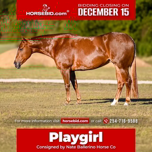 🎄𝐓𝐇𝐄 𝑯𝒐𝒍𝒊𝒅𝒂𝒚 𝐂𝐋𝐀𝐒𝐒𝐈𝐂🎄 Happening now thru MONDAY | DECEMBER 15th - Available EXCLUSIVELY on HorseBid's website! For more details and to register visit: www.Horsebid.com CONSIGNOR CONTACT: Nate Ballerino Horse Co 254-716-9588 LOCATION: Waco, TX BREED: AQHA REGISTERED: Yes REGISTERED NAME: IMA HOUSTON PLAYBOY COLOR: Sorrel HEIGHT: 14.3 AGE: 4 GENDER: Mare This mare is as broke and correct as they come, with a fast, snappy turnaround, smooth lead departures, and a big, natural stop that comes easy to her. She’s been used outside to gather cows and sorting pairs, staying calm, willing, and sure-footed no matter the terrain. Savvy and confident in the arena, she’s ready to go on in whatever direction you choose—whether you’re looking to make a rope horse or simply want a well-bred, well-made using horse with all the right fundamentals, she’s a standout prospect with all the makings of a great one.