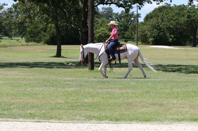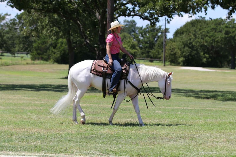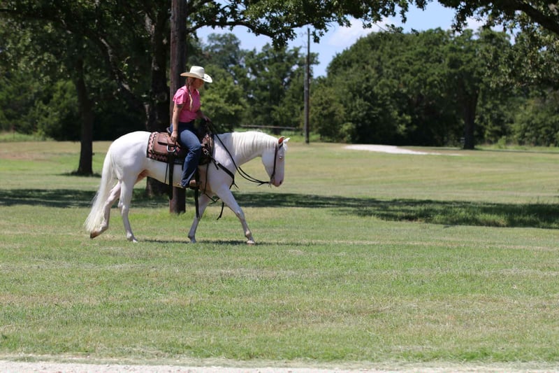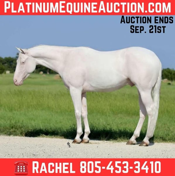 ONLINE AUCTION Place your bids at www.PlatinumEquineAuction.com Starting Bid $3500 Auction ends September 21st, 2025 Need a new saddle? Check out White Rock Saddles on our website or Facebook If you are wanting to stand out and turn heads everywhere you go check out HF I Glow aka Q-Tip. Q-Tip’s Snow White coat and crystal blue eyes are only some a things that make this gelding unique. Q-Tip is a 2022 model, stands 15 hands tall and has lots of bone. Q-Tip definitely has a black type pedigree making him an excellent prospect. Q-Tip is sired by Spooks Gotta Gun the NRHA 3 million dollar sire, and out of a Jacs Electric Spark mare. Q-Tip would make a phenomenal L1-L2 Reiner or would excel in the ranch riding and trail classes. Q-Tip has a beautiful extended trot that would really make him stand out in the Ranch Riding. Q-Tip really has a big stop making him a great candidate to make a rope horse as well. Q-Tip can really go any direction you want to take him. If you would like to make an appointment to try Q-Tip please call Rachel with Rafter R Horses 805-453-3410. Located in Decatur, TX. ONLINE AUCTION Place your bids at www.PlatinumEquineAuction.com Starting Bid $3500 Auction ends September 21st, 2025 Need a new saddle? Check out White Rock Saddles on our website or Facebook
