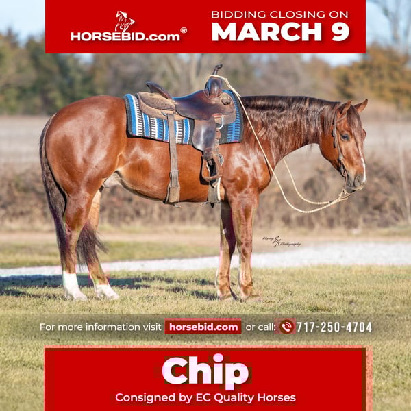 ℳ𝒶𝓇𝒸𝒽 ♦️𝐑𝐈𝐃𝐄𝐑'𝐒 𝐂𝐇𝐎𝐈𝐂𝐄♦️ Happening now thru MONDAY | MARCH 9th - Available EXCLUSIVELY on HorseBid's website! For more details and to register visit: www.Horsebid.com CONSIGNOR CONTACT: EC Quality Horses 717-250-4704 or 443-851-1253 LOCATION: Beaver Springs, PA BREED: Quarter Horse REGISTERED: Yes REGISTERED NAME: CCR CHIPSINTOWN COLOR: Sorrel HEIGHT: 15 AGE: 4 GENDER: Gelding “CCR CHIPSINTOWN” aka Chip is a 2022 model Sorrel Gelding Registered in the AQHA. He stands approximately 15hh tall and built to last a lifetime. He’s solid, thick made, and has great confirmation! Looking for a horse that can do ANY discipline? Chip can excel in all categories anything from reining, working cow horse, ranch pleasure, ranch riding, working western rail, trail, and even english equitation! He’s honest and kind! He is one that rides phenomenal inside and just as good on the outside! We have had Chip around cows, farm equipment, dogs, cars, and even a zebra! Nothing seems to phase this guy! Chip rides both english and western. He will walk, trot, extend trot, canter, and slow lope. He knows his leads and lopes nice collected circles. He has a one hand neck rein, backup, and side pass. Chip will spin both directions and no need for hands! He will also slide stop! He’s soft in the bridle and will even just ride around with a string around his neck. Chip is always the one i pick from the barn to ride. He’s reliable and always a blast to ride! We have taken Chip out on the trails! He has crossed over logs, through brush, over rock, through mud, and through water! Wherever you point Chip that’s where he will go! He’s really the best boy! Chip loads and unloads on and off the trailer. He stands to get saddled, unsaddled, mounted, and dismounted from. If you want a horse that checks all the boxes you need Chip! You won’t be disappointed! Chip is selling 100% Sound! A PPE is welcome at the buyers expense. He will come with a current coggins and health certificate after purchase! For further information regarding Chip please don’t hesitate to reach out to Carley @ 717-250-4704 or Evan @ 443-851-1253 SIRE: TINSELTOWN FLASH (2012). $136,148: Congress Open Reining Futurity Champion; finalist NRBC Derby Open twice; finalist NRHA Open Futurity. Sire of 9 money earners, including UBETRBETHINKNABOUTIT ($6,240: finalist Congress Reining L4 Open Futurity), I PITY DAH FOOL ($3,771: finalist Congress Open Reining Futurity L2), TINSELTOWN FLASHER ($3,603: East Central Regional Affiliate Reining L4 Open Futurity Co-Reserve Champion), DIZZYS DIRTY BLONDE ($3,346: Michigan Memorial Reining L4 Non-Pro Futurity Champion), RUFN UP TINSELTOWN (NRHA $1,452), TIGER DUN IT (finalist Congress Reining L1 Open Futurity). DAM: SOULA JEWELLA (2009). Dam of 3 money-earners, including CCR VOODOO STAR ($49,524: Buckeye Reining L4 Open Futurity Reserve Champion), CCR BET SHESA STAR ($4,464: ARHA Honor Roll Ranch Cutting Youth Champion). Halt-sister to LIL JEWEL ($69,360: split 3rd NRHA Int. Open Futurity), SUPERMANS JEWEL (P) ($21,497: finalist Abilene Spectacular Open Derby). Out of DOTS JEWEL, a half-sister to VALENTINE DREAMIN ($36,094: 3rd West Coast Spectacular Open Reining Derby), JESSIE DOT TARI ($32,944: finalist NRHA Open Futurity), HOLLYWOOD LOLITA ($25,845: NRHA Limited Non-Pro Futurity Reserve Champion).