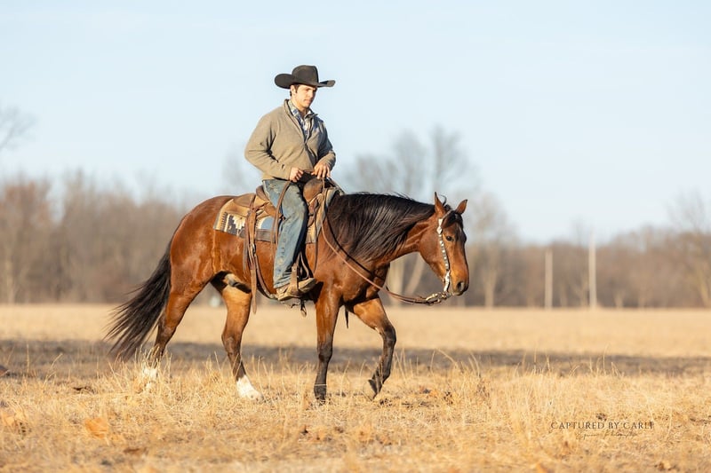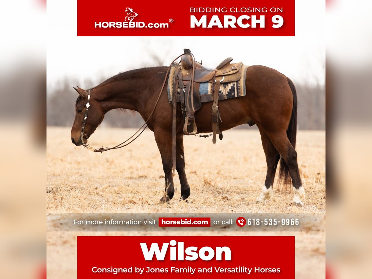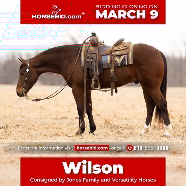 ℳ𝒶𝓇𝒸𝒽 ♦️𝐑𝐈𝐃𝐄𝐑'𝐒 𝐂𝐇𝐎𝐈𝐂𝐄♦️ Happening now thru MONDAY | MARCH 9th - Available EXCLUSIVELY on HorseBid's website! For more details and to register visit: www.Horsebid.com CONSIGNOR CONTACT: Jones Family and Versatility Horses 618-535-9966 LOCATION: Lewistown, IL BREED: Quarter Horse REGISTERED: Yes REGISTERED NAME: CSF DUNIT AT THE BAR COLOR: Bay HEIGHT: 15 AGE: 4 GENDER: Gelding Wilson’s classy presence captures the room the moment he walks in. This gorgeous 15 hand gelding has been brought along the right way from day one. He is a true testament to the Quarter Horse from his solid build and balanced conformation to his quiet demeanor and kind disposition. With his striking appearance, flowing mane and tail, adequate bone, and natural balance, there is no doubt Wilson is built for longevity. He naturally carries himself with confidence and class. Wilson has a thoughtful, experienced approach to his surroundings. He is aware and attentive, always trusting his rider and confidently handling any obstacle placed in front of him. His willingness and heart set him apart he gives 110% every time you swing a leg over him. On the ground, Wilson is a gentleman. He is easy to catch, bathe, saddle, and handle. He ground ties and stands quietly. Under saddle, he offers a great feel and handle. He picks up his leads, has smooth transitions, a correct turnaround, and a deep stop. He is soft, supple, and comfortable performing lateral maneuvers. Wilson is ready to go in any direction. He would excel in ranch riding, make a solid roping prospect, or step right in as a dependable family horse. He would also look sharp under English tack. His versatility makes him a standout candidate for a wide range of riders and disciplines. His pedigree speaks for itself going back to Hollywood Dun It and Martha’s Mega Jac and several others. With that kind of proven lineage behind him, it is no wonder he possesses the athleticism, mind, and trainability that make him such an exceptional gelding. He was started as a two year old by a close, trusted friend and talented horseman, and we continued his training from there so he has always been in good hands and we know his history. He has no bad habits. Wilson has been used in a ranch setting pushing and sorting cattle and handles the job with confidence and sense. He settles easily into new environments and travels well. Whether it’s a new arena, trail, or setting he hasn’t seen before, he takes everything in stride and handles it sensibly. Wilson is the kind you genuinely enjoy having around. He’s the type of horse you look forward to riding every day steady, dependable, and fun to own. We are very proud to offer Wilson.