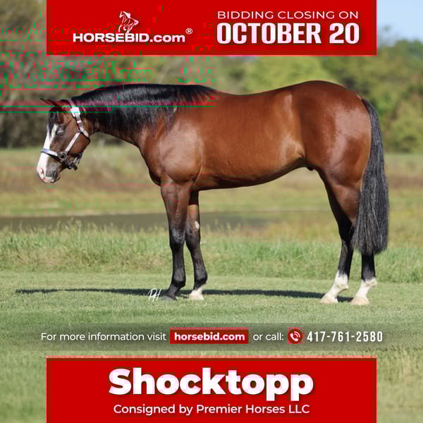 ♦️ 𝐭𝐡𝐞 𝐀𝐌𝐄𝐑𝐈𝐂𝐀𝐍 𝓕𝓪𝓵𝓵 𝓒𝓵𝓪𝓼𝓼𝓲𝓬 ♦️ Happening now thru MONDAY | OCTOBER 20th - Available EXCLUSIVELY on HorseBid's website! For more details and to register visit: www.Horsebid.com CONSIGNOR CONTACT: Premier Horses LLC 417-761-2580 LOCATION: Buffalo, MO BREED: Quarter Horse REGISTERED: Yes REGISTERED NAME: Shocktopp COLOR: Bay HEIGHT: 15 AGE: 3 GENDER: Gelding Shocktopp isn’t your average 3 year old, stick around and you will find out why! He is our daughter’s first pick to go ride, she is only 6 and I think that speaks volumes to the horse he is. Apollo is sired by Spooks Gotta Spark NRHA LTE: $280,799 and offspring earnings: $40,000+ with this being the first year his goals have been eligible to compete. His dam, Corona Tag, boasts an impeccable resume herself with NRHA LTE: $13,480 and offspring earnings: $85,843+. It is no mistake, Apollo was born for greatness. If you want to standout, he checks that box too. Gorgeous dark bay coat with a long and thick mane and tail, yes that’s his real tail! He has the cutest little white socks paired with a bold blaze face, that makes his striking blue eyes really pop. Apollo was in Kaci O’Rourke’s reining program, so he has the best start and foundation you could ask for! He does all the maneuvers and is loaded with talent. Apollo has fancy and fast circles, flawless spins, and a strong stopper. Our daughter loves riding him, Apollo really takes care of her and it’s easy to see how much fun they share. She can easily spin, stop, trot and lope him and he always takes care of her. He can still be easily prepped for the show pen to make an excellent reiner. Apollo is all business on the trails, surefooted over any terrain. He goes through water, over bridges, and across all the obstacles. If you think that’s cool, you can even pull a classic little red wagon behind him, that’s toting a kid holding the American Flag. He rides bareback with hula hoops around his neck too! Apollo is the most kind hearted and genuine gelding to be around, he makes you fall in love with him on the spot. We think he is very special and a true gem of a horse, the kind you come across once in your life.