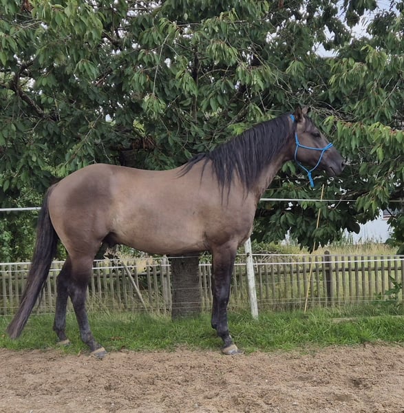 "HOSSA DUNIT MAXEN" (Rufname: "BEN") Ben ist ein wunderschöner Grullo Wallach. Wir haben ihn als Fohlen gekauft um mit ihm unsere kleine Quarterhorse-Zucht weiterzuführen. Wir haben von ihm zwei Söhne bekommen, auf ein weiteres Fohlen hoffen wir im nächsten Jahr. Jetzt ist er ein glücklicherer Wallach und läuft in unserer Herde mit Stuten, seinem kleinen Sohn und einem weiteren Wallach. Ben wird im nächsten April 5 Jahre alt und uns ist bei uns völlig unterfordert. Wir haben gelegentlich ein wenig Bodenarbeit mit ihm begonnen und er ist für März 2026 bei einem Profi-Trainer zum Beritt angemeldet. Der reservierte Platz kann übernommen werden. Ben hat einen wunderbaren Körperbau, geniale Beine, schwarze Hufe und ein wunderschönes Gesicht. Vom Charakter ist er dem Menschen zugewandt, beißt nicht, tritt nicht, schmiedefromm. Ben hat es verdient eine Hauptrolle zu spielen. Bei uns hat er nur eine Nebenrolle. Wir möchten unseren Bestand reduzieren: Ebenfalls abzugeben ist sein wunderschöner Sohn, geboren Juni 2025 und/oder eine tragende buckskin-Stute geboren 2022. Bitte rufen Sie an oder kontaktieren uns einfach über Handy Nr. 015780273780.