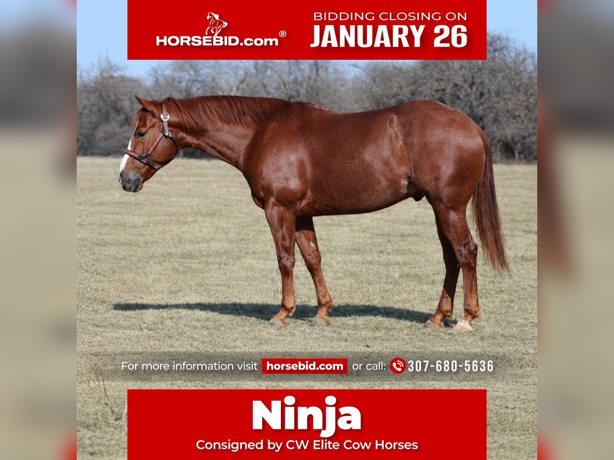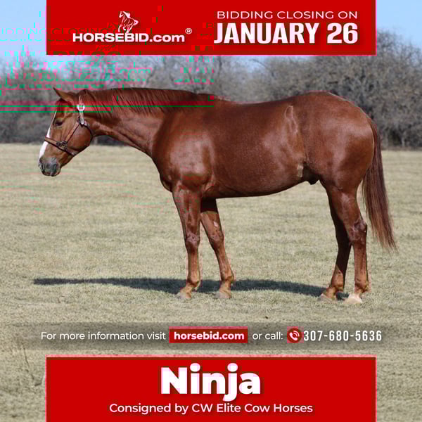 𝐉𝐀𝐍𝐔𝐀𝐑𝐘 ⭐️𝑨𝒍𝒍 𝑺𝒕𝒂𝒓 𝑳𝒊𝒏𝒆𝒖𝒑⭐️ Happening now thru MONDAY | JANUARY 26th - Available EXCLUSIVELY on HorseBid's website! For more details and to register visit: www.Horsebid.com CONSIGNOR CONTACT: CW Elite Cow Horses 307-680-5636 LOCATION: Healdton, OK BREED: AQHA REGISTERED: Yes REGISTERED NAME: Dual Merada Kat COLOR: Sorrel HEIGHT: 14.1 AGE: 5 GENDER: Gelding "Ninja" is a 14.1hh sorrel AQHA gelding. He is sired by Kit Kat Sugar, the $14 million sire by the legendary High Brow Cat! Kit Kat Sugar has NCHA earnings of $240,903. He is an NCHA Super Stakes Reserve Champion and an NCHA Horse Of The Year. His foals have been successful in the cutting pen, reined cow horse, and roping pen. They are athletic, versatile, and great minded! This gelding has all of those attributes! His dam, Ms Brandy Alexander is sired by Cats Merada and won $2,980 in the NCHA. Cats Merada is an NCHA money earner of $177,900 and has sired earners over $7.9 million. "Ninja" has been used on the ranch, he is rope broke, started tracking the sled, he gathers and sorts pairs, he's been hauled to events, and is used daily in our program turning back and working alongside the cutting horses. He can go any direction, he's talented, trainable, and can work all day. He has a huge stop, he collects, neck reins, knows seat and leg cues, and has patience when you need it. He has the foundation to make an exceptional breakaway, calf, or heel horse! Sorters and penners, take a look! He's gritty, fast, and willing to do anything you ask! He is eligible for these Incentives: ⦁ NRCHA Cow Horse Incentive ⦁ NCHA Super Stakes ⦁ PCCHA Stallion Stakes ⦁ Breeders Invitational ⦁ Riata Buckle ⦁ Royal Crown Roping ⦁ Gold Buckle Futurity ⦁ Kit Kat Sugar Bonus He is sound, healthy, and up to date on Coggins, Farrier, Dental Work, Deworming, and Vaccinations. If you are looking for a really good gelding straight out of Clay's program...this is him!