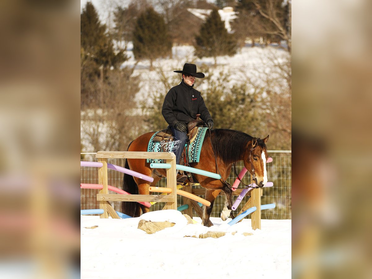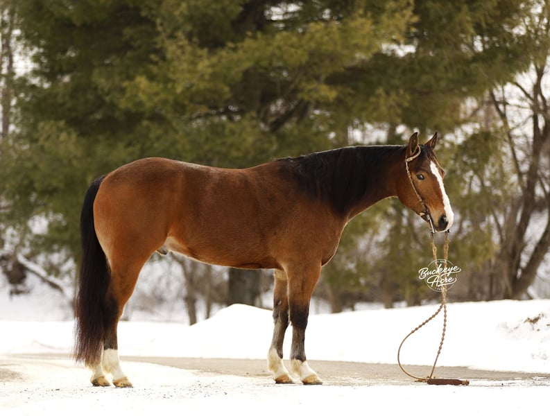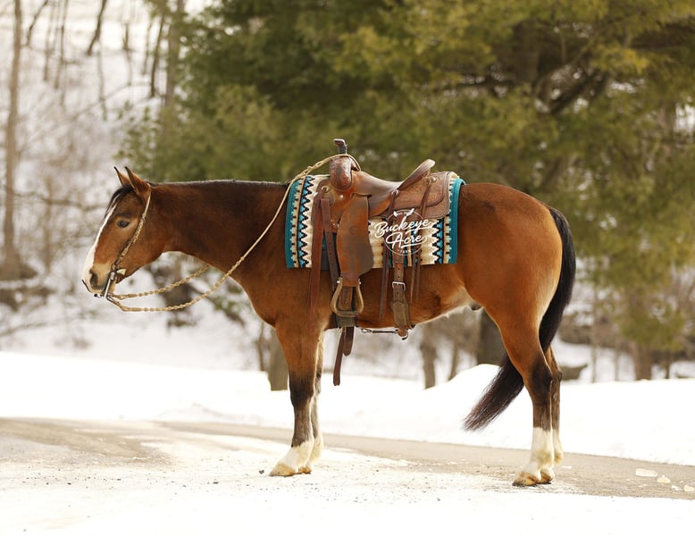 If you are looking for the total package wrapped in chrome, class, and character, Atticus could be your guy. Standing a strong and sturdy 14.2 hands, this 2021 Quarter Horse Cross Bay gelding is as eye-catching as they come, marked with four crisp white socks, a bold white blaze, and a rich black mane and tail that demand attention wherever he goes. He has that balanced, athletic build everyone loves, and he carries himself with confidence and presence whether he is in the arena or out on the trail. But his good looks are only the beginning. Atticus is a true gentleman inside and out — the first to meet you at the gate and happiest when he is by your side. He genuinely enjoys people and aims to please in everything he does. He is the kind that builds a connection quickly and wants to be your partner. In the barn he is quiet, respectful, and well-mannered. He stands tied, behaves in his stall, and is easy with other horses or perfectly content on his own. He hauls well, handles new places with confidence, and settles in without stress. Atticus has truly been there and done that. He has logged miles and miles on the trails, confidently crossing creeks, climbing hills, easing down steep slopes, and stepping over logs without hesitation. He has been ridden on state roads in traffic and remains steady and level-headed. Traps, whips, jugs, commotion — none of it phases him. He keeps a calm mind and is the same dependable horse every time you swing a leg over. If you are looking for something extra special, Atticus brings the wow factor. He will sit down on cue, step up onto a pedestal, and you can even stand on top of him. He enjoys having a job and showing off what he knows, always willing and always trying his best for his rider. Under saddle he is smooth, balanced, and correct in all his gaits with a comfortable stride you can ride all day. He side passes, picks up both leads with ease, neck reins confidently, and rides soft in the bridle. He is responsive without being overly sensitive — forgiving and safe for a beginner, yet broke and refined enough for an advanced rider to truly appreciate. He can even ride bridle less, which speaks volumes about his training and willingness. With his standout color, solid training, kind heart, and steady mind, Atticus is the kind that does not come along every day. From the arena lights to long trail rides, he is ready to be someone’s trusted partner and turn heads while doing it. If this sounds like the horse that you have been looking for, please feel free to reach out to Duane @ 330-231-2324