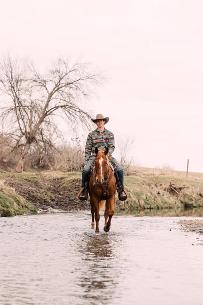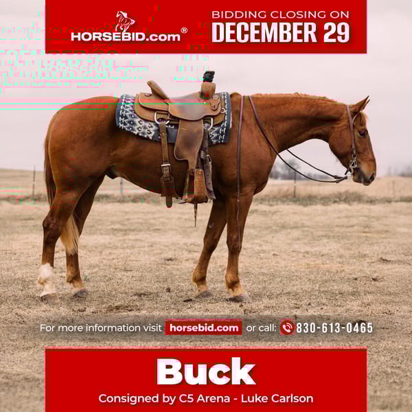 ⚜️ 𝓗𝓮𝓻𝓲𝓽𝓪𝓰𝓮 𝐖𝐢𝐧𝐭𝐞𝐫 𝓒𝓵𝓪𝓼𝓼𝓲𝓬⚜️ Happening now thru MONDAY | DECEMBER 29th - Available EXCLUSIVELY on HorseBid's website! For more details and to register visit: www.Horsebid.com CONSIGNOR CONTACT: C5 Arena - Luke Carlson 830-613-0465 LOCATION: Decorah, IA BREED: AQHA REGISTERED: Yes REGISTERED NAME: Smart Talkin Money COLOR: Sorrel HEIGHT: 14.3 AGE: 4 GENDER: Gelding Buck is a solid, well-built gelding standing 14.3 hands tall and weighs 1100 pounds at 4 years old. We have owned Buck since he was a weanling. He is a true barn favorite and seasoned rope horse with the heart, mind, and skills to do it all. He always meets you at the stall door and will walk up to you in the pasture to be pet and loved on. Buck is great in a herd or in a stall. He is soft in the face, one-hand neck rein, moves off leg pressure, stops hard, and rates cattle with ease. He is safe for all levels – confidence builder for beginners, but enough motor and athletic ability for experienced ropers. Buck is our goto horse for beginner riders as he is so patient and forgiving. Big time switch ender right here! Or he has the talent and ability to go in any direction. He is experienced on the head and heel side. He has been hauled and won on at jackpots! He stands quiet in the box and leaves off your hand. Buck is a horse that is very easy to rope on has all the speed you need. Buck is consistent and has a nice bend in the corner. He loads easily in the trailer and stands quietly tied. This horse is so special as he is athletic but has a gentle personality. Buck will do all aspects of ranch work like pushing, gathering, and sorting cattle. He will go wherever you point him, and is very quick to learn. He is confident and will cross fallen logs that are in front of him. He doesn’t hesitate to walk through water and goes through all types of terrain. This horse is the kind everyone gets along with – honest, kind-eyed, and always gives 100%. Buck is a solid, reliable, go-anywhere-do-anything type. We can’t say enough good things about this gelding. He has always been sound and healthy. Current on deworming, farrier, and coggins. Located in Decorah Iowa. FMI call Luke 830-613-0465.
