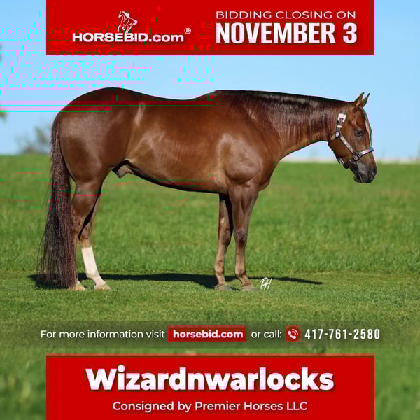 ⚜️𝐓𝐇𝐄 𝐅𝐀𝐋𝐋 𝐇𝐄𝐑𝐈𝐓𝐀𝐆𝐄 𝐂𝐋𝐀𝐒𝐒𝐈𝐂⚜️ Happening now thru MONDAY | NOVEMBER 3rd - Available EXCLUSIVELY on HorseBid's website! For more details and to register visit: www.Horsebid.com CONSIGNOR CONTACT: Premier Horses LLC 417-761-2580 LOCATION: Buffalo, Missouri BREED: Quarter REGISTERED: Yes REGISTERED NAME: Wizardnwarlocks COLOR: Chestnut HEIGHT: 15 AGE: 4 GENDER: Gelding Have ever dreamed of owning a high class gelding that can you to the top? Well, your search is over and you will not want to miss out! Wizardnwarlocks is affectionately known as Ozzy around the barn. He is the epitome of an all around and automatic type of gelding, plus he is just drop dead gorgeous. Ozzy is a rich colored liver chestnut that is appealing to draw your eyes across, paired with unique blaze and one cute stocking. He has a tail that drags the ground, literally, and a long flowing mane to match. Ozzy was no mistake and bred to be a super star. He is sired by, NRHA youngest $4 million dollar sire, Inferno Sixty Six. His sire also boasts an LTE: $220,000+ and offspring earnings soaring to now $4.5 million. Pretty Whiztler, his dam, is exceptional herself having a winning show record with an NRHA LTE: $9,100+ and offspring earnings of $33,000+ and growing. Pretty Whitzler is sired by the infamous, Top Sail Whiz. Ozzy is royally bred and it shows in his quiet disposition and a natural cadence when you are riding him. He never wavers on the trails and is always the go-to when we want to have an enjoyable day. Ozzy travels down steep and rocky embankments with patience, knowing where to put his feet every step. Whether it’s small puddles, belly deep rivers, or deep creek beds Ozzy has got you covered and goes through it all. Traffic safe down gravel roads and while you are riding down there go check the mailbox on him, he is easy. He is surefooted and confident when going over any obstacle and bridge we have asked him to. Ozzy is not just a trail extraordinaire, he is fun and fancy to ride around. He does all the reining maneuvers; smooth spins, seamless lead changes, and a pretty stopper. Just all around easy to ride, so much so our daughter begs to ride him bareback every chance she gets. It does not stop there, Ozzy has more to show you. He gets used a couple times a weekly to go help sort and gather cattle, but has lightly started being roped off of as well. Now that you know he does everything, you do not even need a bridle or saddle to ride and enjoy Ozzy. He is so pleasant to be around and loves people. We truly believe he would suit just about anyone’s program and for almost any level of rider.