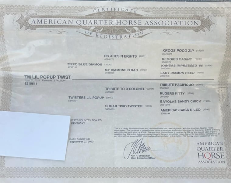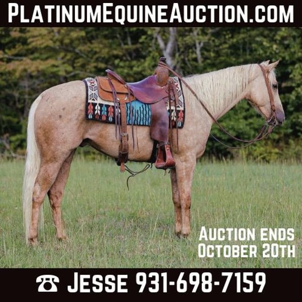 ONLINE AUCTION Place your bids at www.PlatinumEquineAuction.com Starting Bid $3500 Auction ends October 20th, 2024 Need a new saddle? Check out White Rock Saddles on our website or Facebook! TM LIL POPUP TWIST aka Twist is a registered 2021 model AQHA gelding that’s as cool and gentle as they come. He has had 6 months of professional training by an outstanding trainer along with thousands of miles put on him after training and is absolutely BROKE. One of our favorite things about him is his very calm and puppy dog temperament. No matter what situation you are in Twist NEVER gets stirred up. Twist has started to lay down on command, stands to be tacked and mounted, flying lead changes, side passes with ease, and has a big stop. We have had Twist in just about every situation a horse could be in from roping cattle in the pasture, ponying colts, trail riding on steep terrain and even let the kids take him out for an all day trail ride alone!! Twist is one of the most diverse 3yr old geldings you will ever find and has seen about as much as most seasoned aged geldings! For more info on Twist call Jesse Thomas 931-698-7159 Located in Santa Fe, TN. ONLINE AUCTION Place your bids at www.PlatinumEquineAuction.com Starting Bid $3500 Auction ends October 20th, 2024 Need a new saddle? Check out White Rock Saddles on our website or Facebook!