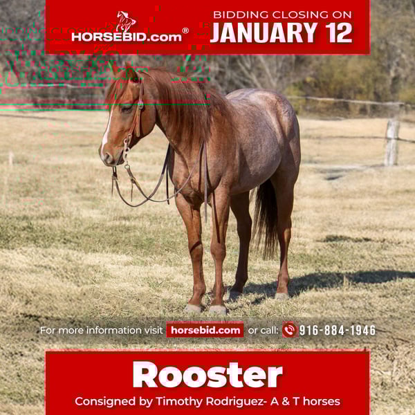 ♦️𝐍𝐄𝐖 𝐘𝐄𝐀𝐑'𝐒 𝑬𝒙𝒕𝒓𝒂𝒗𝒂𝒈𝒂𝒏𝒛𝒂♦️ Happening now thru MONDAY | JANUARY 12th - Available EXCLUSIVELY on HorseBid's website! For more details and to register visit: www.Horsebid.com CONSIGNOR CONTACT: Timothy Rodriguez: A & T Horses 916-884-1946 LOCATION: Palmer, TX BREED: QH REGISTERED: No REGISTERED NAME: Rooster COLOR: Roan HEIGHT: 15 AGE: 5 GENDER: Gelding t’s that time of the year where you need to welcome this Gentleman we call “Rooster” to you home who will with no doubt; steal your heart! If there was ever a horse that could steal your mind, heart & soul and ride off into the gloaming evening with it — it’s Rooster. This red roan gelding is as striking as they come! He’s the kind that makes people stare! .But looks aren’t what make Rooster one of a kind — it’s that easy, old-soul attitude. At a TRUE 5 years old and standing at a solid 15 hands, he’s kind, honest, and absolutely balanced in all aspects. He’s been used all over the ranch — doctoring, sorting, and checking pastures — and he takes it all in stride. He’s traffic-safe, flag-proof, balloon-proof, and obstacle approved. Ride him alone down the road or out in a crowd — he’s as cool as a cucumber! Rooster is a big beautiful mover with a collected way of going that turns heads in the arena and eases up any country outside. Water, brush logs or narrow paths he will compass his way through it. Fancy enough for the show pen, broke enough for ranch work, and gentle enough for the whole family. Rooster has a smooth collected stop, nice turnaround, and a brain that always says “yes, sir.” Whether you want to look good doing a job or just enjoy the ride, Rooster is the kind of gelding that does it all — with style, grace, and just a touch of charm with his sweet and kind demeanor!! He’s UTD on worming, shots and dental work! 100% sound with no maintenance whatsoever! He has hard black feet and is an easy keeper!!