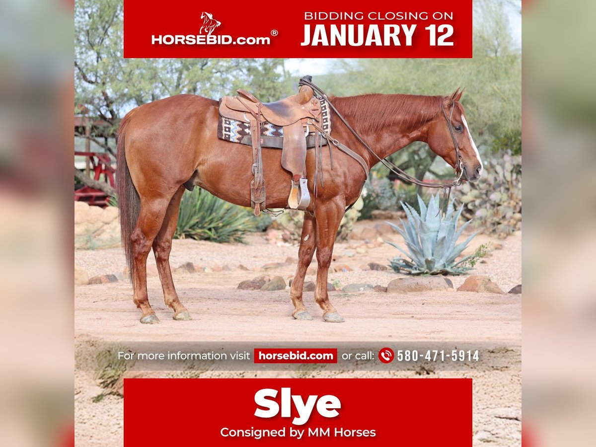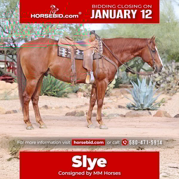 ♦️𝐍𝐄𝐖 𝐘𝐄𝐀𝐑'𝐒 𝑬𝒙𝒕𝒓𝒂𝒗𝒂𝒈𝒂𝒏𝒛𝒂♦️ Happening now thru MONDAY | JANUARY 12th - Available EXCLUSIVELY on HorseBid's website! For more details and to register visit: www.Horsebid.com CONSIGNOR CONTACT: MM Horses 580-471-5914 LOCATION: Cave Creek AZ BREED: AQHA REGISTERED: Yes REGISTERED NAME: Levin Slye COLOR: Sorrel HEIGHT: 15.1 AGE: 5 GENDER: Gelding Slye is a 15.1 hand 1200lb sorrel streak face gelding. He is the perfect build for a performance horse.He has a short back,good withers,and plenty of foot and bone.Slye was started by a professional horse trainer as a 2 yo then started on the barrels by his owner as a 3 yo and continued training until I bought him as a 4 yo since I have had him I have ridden him every where from the rough trails here around cave creek to the busy town streets, but mostly have headed steers on him. He has made a very nice horse as he is always quiet and gentle but when asked can really run. Although he is very fast he is not hot in any way. He is great in the box, scores every time and stout to the horn. Slye can be shown in Pink/Ruby and Riata Buckle plus many other futures He is guaranteed sound with no vices. Call with any questions