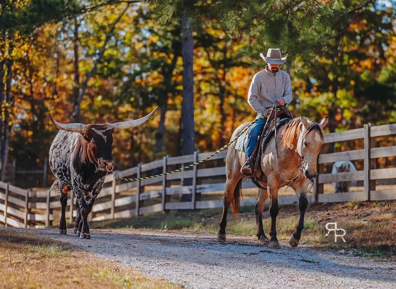 🎲𝓽𝓱𝓮 𝐑𝐈𝐃𝐄𝐑'𝐒 𝓒𝓱𝓸𝓲𝓬𝓮🎲 Happening now thru MONDAY | NOVEMBER 17th - Available EXCLUSIVELY on HorseBid's website! For more details and to register visit: www.Horsebid.com CONSIGNOR CONTACT: Double R Ranch Horses 931-623-1706 LOCATION: Lyles, TN BREED: Quarter Horse REGISTERED: Yes REGISTERED NAME: Flinging Lemons COLOR: Buckskin HEIGHT: 15.1 AGE: 5 GENDER: Gelding “Laredo” The Buckskin Everyone Loves! (And needs) If you’ve been searching for a safe, steady and easy to ride partner, the kind you can throw a saddle on any day of the week, point in any direction, and know you’re in good hands, meet Laredo. This golden dappled buckskin AQHA gelding is as easy on the eyes as he is steady in the saddle. He’s built right, and absolutely gorgeous- with a friendly, gentle personality that makes him so enjoyable to be around. Registered AQHA registered name “Flinging Lemons” with some impressive bloodlines, this 5 year old gelding stands 15.1 hands tall, has plenty of real-world experience, and a very good mind. Laredo is naturally friendly and loves attention, he is always ready to greet you at the gate. If you enjoy being around horses that are “in your pocket” you’ll love him. He has the kindest eyes and the sweetest soul, and he is ready to be your best bud. He’s quiet and patient on the ground, stands calmly to groom, saddle, and mount, and has excellent manners. Gentle and quiet, he loads, ties, bathes, and stands for the vet and farrier without fuss. He rides soft in the bridle, responds to leg cues, and is smooth and enjoyable. He has been trained to side pass over to pickup his rider on the mounting block as well, which is handy! Laredo has been a trusted trail partner with us. He’s safe, solid and has a good mind. He’s been my go-to choice when I need to pack a kid on board. He’s gone on overnight camping trips, where he crossed deep water, climbed steep rocky hills, and even explored miles of trails with our little one-year-old tucked in the baby carrier. He’s sure-footed, calm, and confident. New scenery doesn’t bother him, creeks, passing wildlife, or navigating through rough terrain, he handles it all with patience and a steady step. It’s easy to relax and enjoy the ride on a seasoned horse like him. You’ll feel at ease on his back! I’ve even hopped on him bareback in the dark and loped him off down the road, and he just calmly carries on like it’s nothing unusual for him. We have put him in about every situation you can think of, and he just proves himself rock solid again and again. He’s also been started on the head side, done a little bit of breakaway, lightly started on barrels, and used for ranch work including pasture roping, loading, doctoring etc. Laredo is versatile, well rounded, adaptable, and ready to succeed in whatever direction his next owner wants to take him. Even if that’s a best friend in horse form! It’s hard to find everything Laredo brings to the table- all in one horse. He has a To sum it all up, He’s just plain good. And in today’s world, that’s hard to find. Laredo passed his PPE by Equine Vet Todd Co Animal Clinic with flying colors! Located in Lyles, TN 📞 Contact Rachel Vick at 931-623-1706 to learn more or schedule a visit to meet Laredo in person.