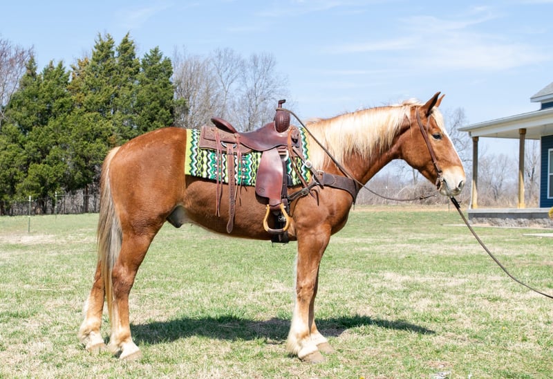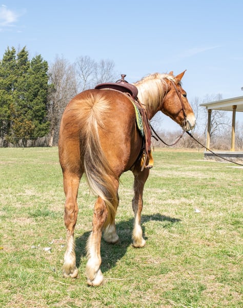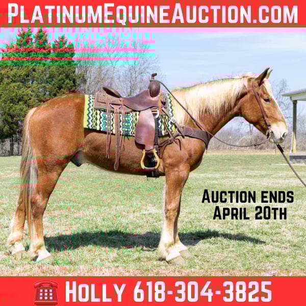 ONLINE AUCTION Place your bids at www.PlatinumEquineAuction.com Starting Bid $3500 Auction ends April 20th, 2025 Need a new saddle? Check out White Rock Saddles on our website or Facebook! If your looking for a draft cross Gelding look no further! Alvin is a great 4 year old gelding that has all the fancy buttons and been used for a trail horse the last few years of his life. He stands 15.3 and stout as an ox! He’s half quarter horse and half Belgium! This awesome gelding will do all the trail obstacles, like cross the ditches and water crossings. He has been rode with the dogs and by himself or with a group of horses. This horse will not get fresh and has never offered to buck. He’s been on over night camping trips and stands on a tie line or in a stall. Alvin has a great short lope in and out of the arena getting both leads correctly. He side passes and has a very nice all around handle with a nice responsive neck rein. This gelding has shoes on all 4 feet and is 100% sound in every way. Easy to catch and handle all around! We are open to PPE at buyers expense. Contact Holly Griffin at 618-304-3825. Located in Greenville Kentucky! ONLINE AUCTION Place your bids at www.PlatinumEquineAuction.com Starting Bid $3500 Auction ends April 20th, 2025 Need a new saddle? Check out White Rock Saddles on our website or Facebook!