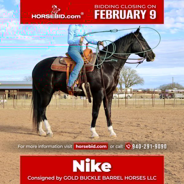 ❤️🔥𝑩𝒆 𝑴𝒊𝒏𝒆 𝐒𝐄𝐋𝐄𝐂𝐓❤️🔥 Happening now thru MONDAY | FEBRUARY 9th - Available EXCLUSIVELY on HorseBid's website! For more details and to register visit: www.Horsebid.com CONSIGNOR CONTACT: GOLD BUCKLE BARREL HORSES LLC 940-291-9090 LOCATION: Aubrey, TX BREED: AQHA REGISTERED: Yes REGISTERED NAME: FOUR YOUR DESIGN COLOR: BLACK HEIGHT: 15.3 AGE: 5 GENDER: Gelding There are a lot of horses for sale online. There is only one Nike. THE HORSE Nike is the 5-year-old Slick By Design gelding with the kind of brain, athleticism, and versatility buyers spend decades trying to find. With less than 30 days on the barrel pattern, he’s already working with confidence and a smooth style most barrel horses never achieve—because he’s been built with intention, not hustle. He’s quiet, correct, and thoughtful in his work. He ropes, he runs barrels, and he stays mentally available—making him ideal for riders who value precision and quality of movement. THE PEOPLE BEHIND THE HORSE Nike’s education is legendary: Foundation training: Robert Chown — 22-Time World Champion Reining & Working Cow Horses Rope training: Clay Burnham -- Well Respected & Accomplished USTRC Roper Barrel pattern: Kendra Dickson — 5X Texas Circuit Finals Qualifier & WPRA Gold Card Member This is not pieced-together training. It’s a deliberate system, designed to make progress logical and speed easy as 1-2-3. Nike’s training is supported by a comprehensive Team leading the field in biomechanics and brain science, giving riders what other brands can't: a clear path, confidence, and technology with data for measurable results. THE GAME-CHANGER Nike is the 1st barrel horse in history offered with his **own riding manual**. Not merely a collection of his best runs. A documentary series of every step, from every day in barrel training with real-time instructions from Kendra you can follow with ease. That's right! Nike comes with his own online video instructional course complete, step-by-step video instructions showing: * Every phase of his barrel training * The decisions made at each step of the turn * How his body is made to move through the pattern * How to ride him without guessing or undoing what’s been built So you don’t take over a mystery or risk inheriting someone else's problem. You’re being handed a personal roadmap—with cutting edge technology and techniques that have produced many champions over the course of Kendra's lifetime. WHAT COMES WITH NIKE * Nike, a young gelding already demonstrating uncommon understanding * His personal step-by-step video riding manual (first of its kind) * Online coaching and educational support, rooted in biomechanics and nervous-system awareness * Over $10,000 value in training courses * Your very own CUSTOM **Bullseye Saddle**—the ONLY barrel saddle with data demonstrating measurable increases in a horse’s stride (For your peace of mind, Nike does not require a special saddle—this saddle is provided for so you'll have the best tool to follow the training provided.) WHY SLICK BY DESIGN MATTERS Slick By Design wasn’t just a great sire—he was a game-changer. * Multiple Qualifications to the Wrangler National Finals Rodeo * $626,000+ in lifetime earnings himself * 2,200+ registered foals * Nearly $11 MILLION in offspring earnings, dominating barrel racing and crossing successfully into other speed events Slick offspring are known for: * Natural speed and willingness to turn * Larger than life personality * Trainable minds and honesty With Slick By Design no longer with us, opportunities to own a quality offspring like Nike come with a finite horizon—and buyers who understand the numbers know exactly what that means. THE PRACTICAL DETAILS (YES, HE’S EASY) * Shod and maintained appropriately * Performance float: Summer 2025 * De-wormed on a consistent program * Loads well, stands tied, and gets along with other horses * Same owner since he was two years old * No known injuries * No special maintenance required If we had to list one thing to fault him on: Nike doesn’t love fast hands around his ears. Move slowly and thoughtfully when haltering and bridling and he is exceptionally kind and easy—on the ground and under saddle. And for the record: Nike is #NOTHOT! Nike has been ridden to town, through traffic, and on asphalt—he's quiet, level-headed, and unbothered. HIS PRESENCE (THIS IS HARD TO PUT INTO WORDS—BUT WE’LL TRY) Some horses look impressive on video and fail to live up to expectations in person. Others make you feel something the moment you stand beside them. Nike is the second kind. We promise if you like Nike's videos, you're going to LOVE him in person!! It’s not just his color. It’s the way he’s comfortable in his own skin—aware, curious, and confident without being cocky. He’s kind, not pesky. Engaged, not entitled. A horse who knows how to put in a solid day’s work—and then settle back into himself. Nike gives barrel horses a good name. He’s not flighty. He’s not high-maintenance. He doesn’t dance around like a stereotypical barrel horse or require constant micro-managing the way so many modern barrel horses do. This is the kind of horse you enjoy every single day—not just on race days. Go ride. Learn to rope. Explore trails. Improve your balance, timing, and confidence with the coaching that comes with Nike. He’s happy to see you. Eager to load on the trailer and go somewhere new. Thankful for your attention—never demanding of it. Nike is the kind of horse you want to take home to Dad. The kind of horse dads feel safe watching their daughters ride off into the sunset on. So whether: * it’s time to chase your own dream, * you’re shopping for a daughter who’s more horse-crazy than boy-crazy, or * you’re ready to bless your sweetheart with the horse she’s always dreamed of… Nike’s versatility, temperament, and genuine heart make him a match for many types of 
