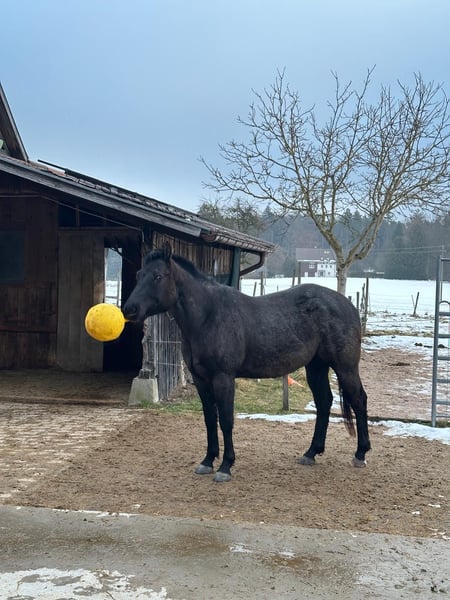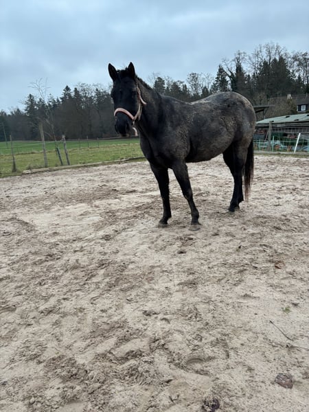 Silver is a very intelligent and handsome gelding, distinguished by his striking Blue Roan coat, who loves to work. He was born and raised in a herd of mares. Currently, he is kept in an open stable with three mares and a gelding. His sire is MJM Salty Blue Ezra, a Hancock horse, making him a ranch horse. Silver has large, strong hooves, a solid build, and is suitable as a weight carrier. He is farrier-friendly and loading-trained, has been ground-worked, and has experience as a lead horse in the terrain.