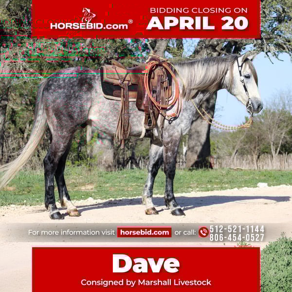 ⚜️𝐭𝐡𝐞 𝓔𝓵𝓲𝓽𝓮 𝐒𝐩𝐫𝐢𝐧𝐠 𝐂𝐥𝐚𝐬𝐬𝐢𝐜⚜️ Happening now thru MONDAY | APRIL 20th - Available EXCLUSIVELY on HorseBid's website! For more details and to register visit: www.Horsebid.com CONSIGNOR CONTACT: Marshall Livestock 512-521-1144, 806-454-0527 LOCATION: Buckholts, TX BREED: Quarter Horse REGISTERED: No REGISTERED NAME: Dave COLOR: Gray HEIGHT: 16 AGE: 5 GENDER: Gelding Dave Dave is a 5 year old finished ranch gelding. He has seen every aspect of ranch work a horse can see. He is currently being used on a high risk yearling operation doctoring and shipping cattle outside. He’s very gentle and easy going, yet can get up and go when asked. He has a nice soft handle, stops nicely, and moves perfectly off of leg pressure. Nothing phases him outside! He rides out nice and quiet on the trail, and can cross just about anything you can point him at while remaining in control and taking care of his rider. He would be a perfect fit for someone looking for a family ranch horse and/or trail horse! He is safe for just about anyone and one hundred percent sound! He’s located in Buckholts, Tx! Call for more info on this sweet and handsome gentleman!