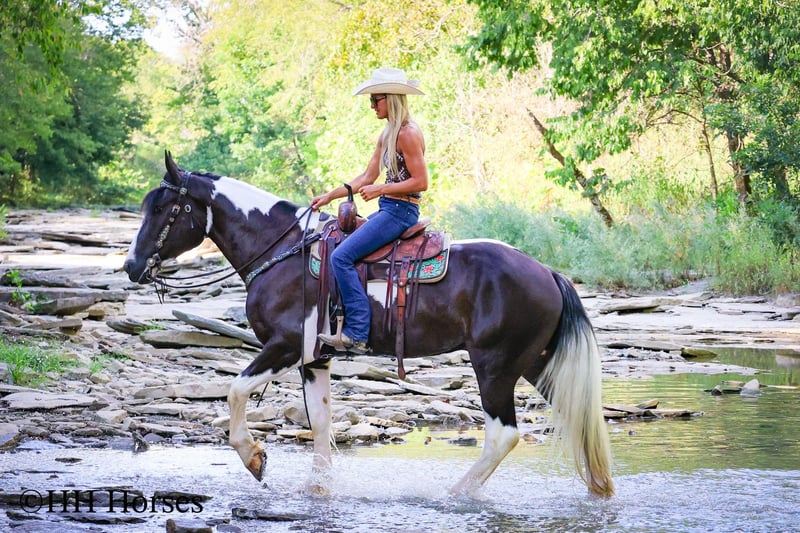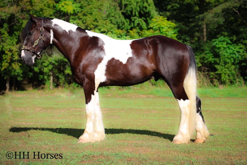 ONLINE AUCTION Place your bids at www.PlatinumEquineAuction.com Starting Bid $3500 Auction ends September 14th, 2025 Need a new saddle? Check out White Rock Saddles on our website or Facebook This is “BIG N’ RICH”, a very stout, extra flashy, super fancy moving, GYPSY VANNER SPOTTED DRAFT CROSSBRED gelding that is broke to ride and drive. He stands 16 hands tall and is 4 years old. He is broke to work double or single and has pulled hay wagons, pumpkin patch wagons, and been hooked to all farm machinery. He has pulled a cart and carriage through holiday parades. He has been in heavy traffic and lots of commotion with no issues. He is a superb trail mount that will go anywhere you point him, willingly and steadily. He is sure footed through very rocky and steep terrain and he takes his time down rough embankments and up and down the rugged trails. He is a love bug on the ground and will soak up all the attention you will give him. He lopes nice circles, catches his leads, stops easily, and backs up. He has been shown in lead line with novice riders. He has excellent ground manners, stands tied, loads, bathes, and hauls with no fuss. Located in Flemingsburg, KY. Contact Erin with HH Horses 304-238-4155 with any questions or to make a Buy It Now Offer. ONLINE AUCTION Place your bids at www.PlatinumEquineAuction.com Starting Bid $3500 Auction ends September 14th, 2025 Need a new saddle? Check out White Rock Saddles on our website or Facebook