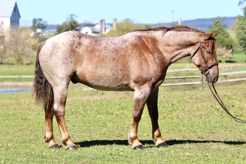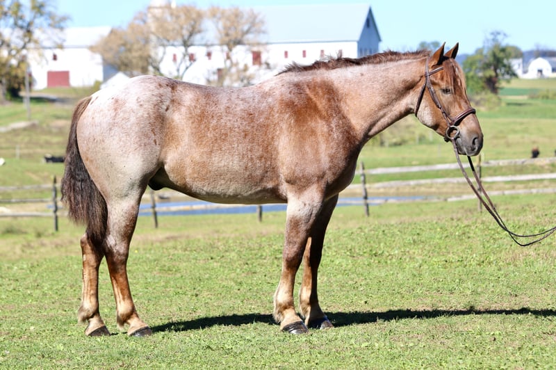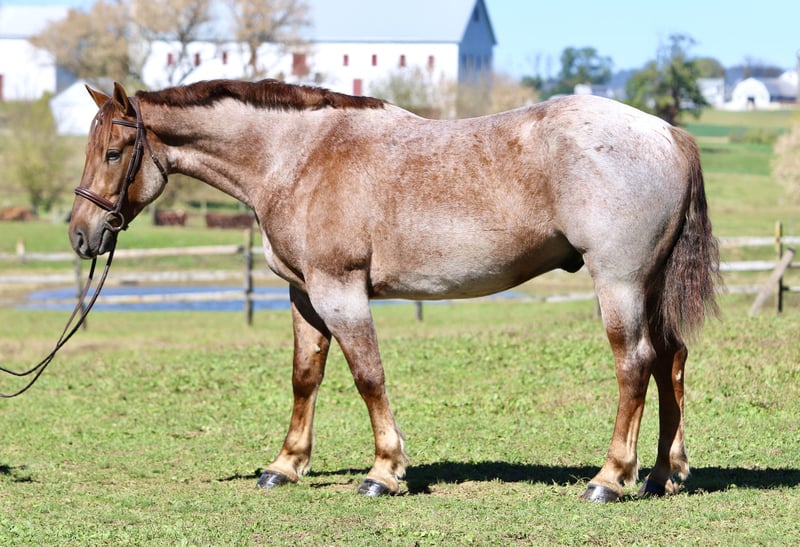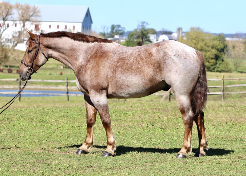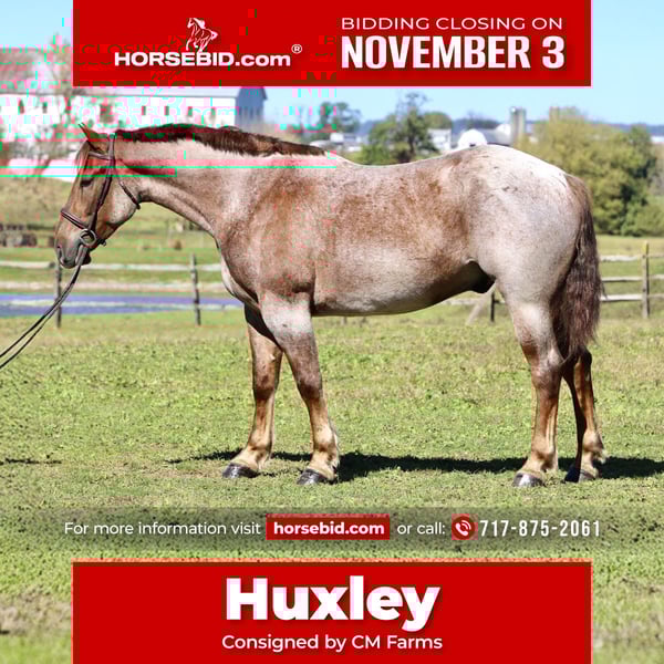 ⚜️𝐓𝐇𝐄 𝐅𝐀𝐋𝐋 𝐇𝐄𝐑𝐈𝐓𝐀𝐆𝐄 𝐂𝐋𝐀𝐒𝐒𝐈𝐂⚜️ Happening now thru MONDAY | NOVEMBER 3rd - Available EXCLUSIVELY on HorseBid's website! For more details and to register visit: www.Horsebid.com CONSIGNOR CONTACT: CM Farms 717-875-2061 LOCATION: Gap, PA BREED: Brabant/QH X REGISTERED: No COLOR: Red Roan HEIGHT: 16.1 AGE: 4 GENDER: Gelding Meet ✨Huxley✨, a 4-year-old Brabant/QHx gelding standing right at 16.1–16.2hh. This handsome man is built right — he has all the curves, excellent conformation, and the personality and skill to match. You wouldn’t believe he’s only 4 years old given his calm, unwavering personality and his talent under saddle. Huxley rides Western, English, bareback, and he drives — and he does not take a wrong step, ever. Huxley has the mind of your old schoolmaster — he’s never in a hurry, he’s dependable, and he’s wise beyond his years. This perfect boy is suitable for any level of rider. He’s a push ride, and while he will teach the kids leg, he knows when an experienced person is on him and will pick up the pace to have a good time. He’s athletic and has endless potential in every discipline. He’s the kind of horse you can hang out with in the stall for hours, or pull out once a month and he’ll act the same — happy to see you, reliable, and in your pocket. In the ring, Huxley is talented and smart. He has already learned to leg yield, sidepass, and spin — and he’ll do it arguably better than your old pro. 😉 He has walk-to-canter transitions both ways and absolutely lovely, slow movement that’s comfortable for anyone’s aches and pains. He’s like sitting on a couch — but not so wide that you’re doing the splits. He’s sturdy enough for the husband or grandpa to take for a spin, and athletic enough to pop over cross rails or take out cross-country. He hasn’t done too much jumping at this age; however, the jumps we have introduced him to, he takes correctly and honestly with cute knees every time. He would make a fantastic foxhunter, one to take on paper chases, or just that reliable husband/guest horse you need in your barn. Huxley is fantastic and unflappable in every way. On the trail, Huxley has packed a variety of riders and is always happy to get out and see the views. He has a little more pep in his step outside the ring and truly seems like he’s enjoying himself. He’s well-behaved in a group — he’ll lead, follow, or go in the middle of the pack without causing drama. He has been over bridges, up and down mountains, in lakes, and through creeks, and he never hesitates. He’s the type you can crack a beer on- and he’ll even share it with you! If you want a safe, solid horse to enjoy your time with — here’s your guy. He has been desensitized to tarps, flags, equipment, traffic, bikes, dogs, deer, and other wildlife, and will even go down the highway without thinking twice. He rides away from the barn and other horses and gives you a feeling of confidence — like you’re on top of the world when you’re on him. He’s such an exceptional young horse that it’s hard to put into words just how special he is. He’s curious, dependable, and has a personality you will immediately fall in love with. Huxley will be your once-in-a-lifetime — the kind you can’t replace. Under harness, Huxley is confident and level-headed. He drives better than horses that have been under harness for ten years. He was born quiet, with a sensibility you simply can’t train. He drives the carriage single or double and has been hooked to various farm equipment. He’s already educated under harness enough to take into the show ring. He behaves the same off-property in new environments as he does at home in his everyday routine. We don’t generally recommend young horses to beginner drivers; however, this is one that’s suitable for anyone. He is safe. He’s had semi-trucks coming at him from both directions and never faltered. He is truly magnificent under harness — the perfect type to learn on and grow with. In the barn, Huxley will be your best friend. He’ll greet you in the pasture and always checks your pockets for treats. He’s sweet, cuddly, and exceptionally well-behaved. He stands quietly to groom, tack up, and bathe, and he’s behaved for both the farrier and the vet. He’s one you never have to worry about — polite in his stall and in turnout. He’s an easy keeper and will load right up into any trailer. He doesn’t mind loud kids or dogs running around his feet, and he’ll even happily give lead line rides to the littles. He’s truly so special, and if we had an extra stall for a personal horse, he’d be staying with us forever. This is an amazing opportunity to get a lovely young horse with truly zero vices — one to spend a lifetime with.