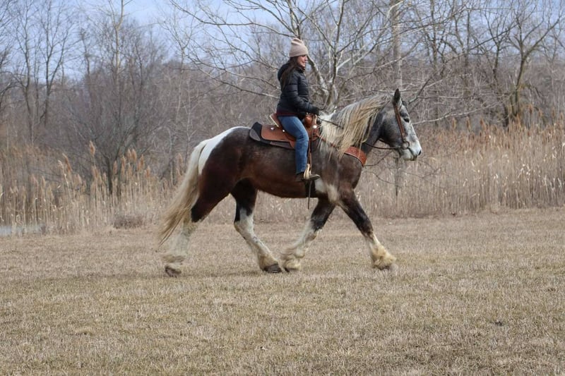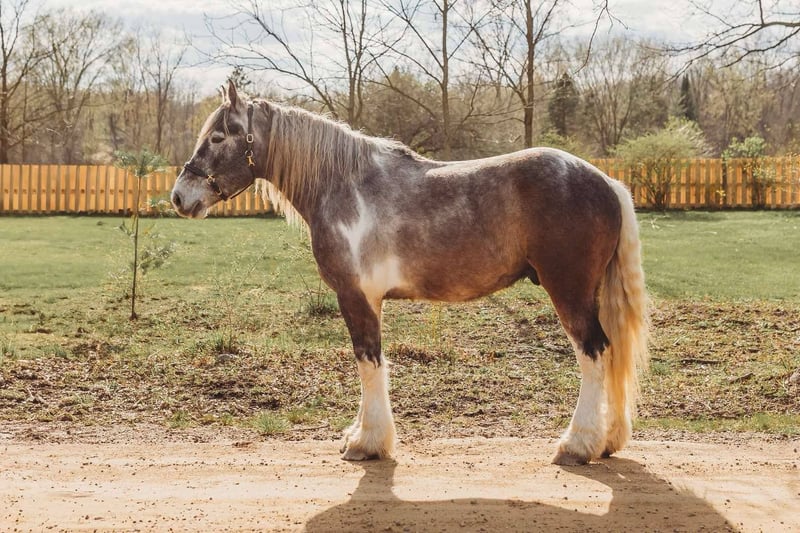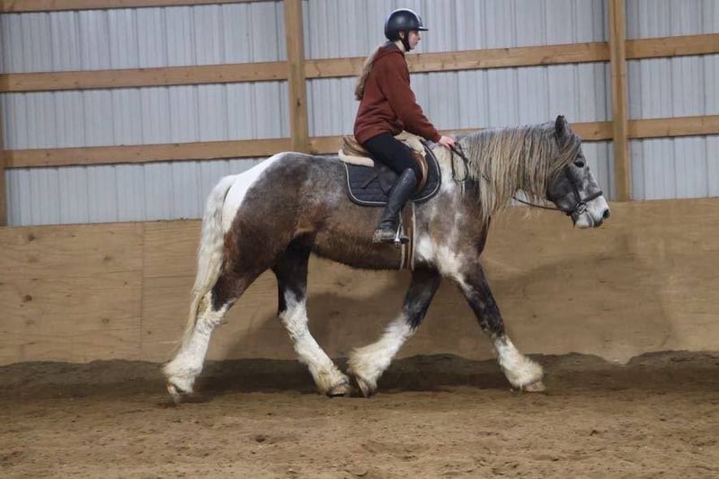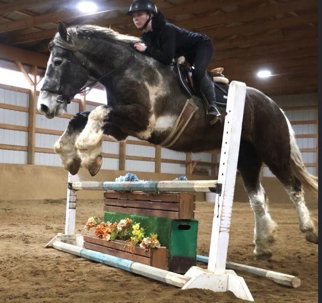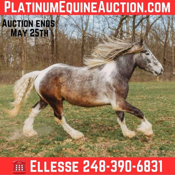 ONLINE AUCTION Place your bids at www.PlatinumEquineAuction.com Starting Bid $3500 Auction ends May 25th, 2025 Need a new saddle? Check out White Rock Saddles on our website or Facebook! Meet Blackstone’s Big John! John is a 17.1hh uniquely colored rose grey and white painted Drum horse gelding. (Percheron, Spotted draft, Gypsy Vanner X) He is as gentle as a lamb. His mane and tail are very thick and natural wavey and he has beautiful feathering on all 4 legs. John is 4 years old. He’s big, he’s pretty, and best of all he’s quiet! John has a beautiful typey face and a kind and expressive eye. He’s the type of horse who wants to be your friend. John is so much like an over grown puppy dog he will follow you all over the pasture and even come trotting up when called. He truly is a best friend type of horse! Anyone can groom lead and handle him on the ground. He is also very easy to catch outside and plays well with other horses. John is nice and quiet under saddle. He works quietly in all gaits with his ears up while being relaxed and happy. He walk trot canters knows his leads and moves on and off your seat and leg. He is alert but shows calm and capable confidence in everything you ask of him! He has extensive trail miles and will go any direction you point him. He’s been down the roads and swam with the kayak’s. John also has some light mileage over fences and he’s bold and brave to any obstacle inside or out. You do not have to have a good eye to get this boy around!! He’s not reactive to new fences facilities or various types of fill. He has been ridden up and down the back roads of Michigan’s beautiful hunt country and would excel in fox hunting. Overall John is a laid back ride but he will move thru the paces off of your voice. He has been hauled to various parks and schooling shows and is very level headed in new places! John is also broke to drive and will work happily in a team or alone. He’s an all around boy that’s got a unique look and is a true a joy to have in the barn. Serious inquiry’s and a loving home only! Big John is located in Howell, MI 48855 give Ellesse Schwartz a call or text 248-390-6831 for more information. ONLINE AUCTION Place your bids at www.PlatinumEquineAuction.com Starting Bid $3500 Auction ends May 25th, 2025 Need a new saddle? Check out White Rock Saddles on our website or Facebook!