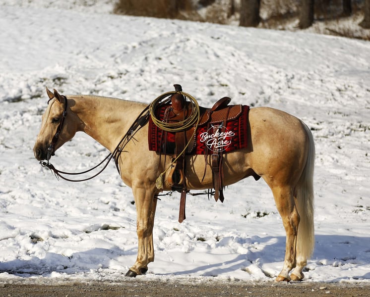 Meet Platinum, a golden palomino gelding with a heart as big as his presence. This 2021 model, 14.2-hand AQHA gelding comes from an exceptional lineage, including Wimpys Little Step, Nu Chex To Cash, and Smart Little Lena. With his flowing mane and tail, bright eye, two white hind socks, and a small white strip on his forehead, Platinum is a horse who naturally draws attention and admiration wherever he goes. Platinum is not just a beautiful horse – he’s a partner you can rely on. He has explored miles of trails, crossed state roads with traffic, and helped check cows and fence lines in the back pastures. He confidently navigates uphill, downhill, over logs, and through challenging terrain, all with his rare, willing-to-please attitude. Every ride with Platinum is smooth and enjoyable, whether at a walk, trot, extended trot, or canter. He knows his leads, performs lead changes, and can side pass right up to the mounting block, making him versatile for every type of ride. He has been ridden western, English, and bareback, in both indoor and outdoor arenas, and is safe and dependable for riders of any skill level – beginner, senior, or advanced. Platinum does not require daily riding to stay consistent; he’s just as ready for a quiet trail ride one day as he is for a show the next. He rides well alone or in a group and enjoys the company of other horses. He loves greeting you at the gate, getting some scratches, and offering his gentle companionship. Platinum needs no maintenance at all. He is up to date on vaccinations, deworming, and shoeing, and thrives without any extra care, making him perfect for someone looking for a versatile, dependable partner. If you are looking for a dependable, kind-hearted, and adaptable horse who can be a family partner, trail companion, or performance mount, Platinum may be the perfect fit. For more information or to schedule a visit to meet him in person, please reach out to Duane at 330-231-2324. Come see this golden gelding in action – he is ready to be your next equine friend.