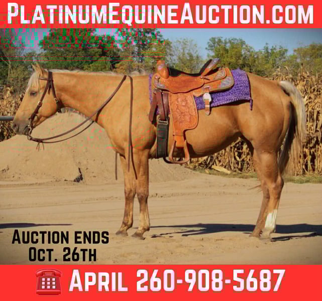 ONLINE AUCTION Place your bids at www.PlatinumEquineAuction.com Starting Bid $3500 Auction ends October 26th, 2025 Need a new saddle? Check out White Rock Saddles on our website or Facebook This stunning lady is a 2020 model, grade, Quarter Horse mare. Tilly stands a stout 15.1 hands tall and weighing in at around 1,200 pounds. This mare is absolutely striking! Tilly is a flashy mare that is always willing to please. Tilly will trail ride out alone or with a large group of people. She will gladly lead the pack, or stay in the back. She goes through water, crosses logs, brush, tall grass, you name it she will go through it. Tilly is TSS and has been riddin around traffic often. She will go up and down any terrain reguardless of the condition. She has been ridden by my teenage daughter for a while now and hasn’t caused her any issues. She has been on lots of trail rides and will stand tied to a picket line overnight. Tilly will ride bareback and double as well. She has been turnt out with geldings and mares, she gets along with either! She is not sour when going away from the barn. Tilly has no rear, kick, buck or bite. She does not require shoes as we only have them on her for trail riding in rocky terrian. She is low maintance and does not require anything extra. Tilly will ride western and English. She lopes right off with the correct lead everytime. She stands for the ferrier and to be groomed. Tilly trailers like a dream, you dont even know shes back there. She likes to do arena work, and is excelling in pattern work daily. She will cross bridges, go over tire towers, and pole obstacles. Tilly would excel as a ranch horse, she loves to have a daily job! She will keep it slower if asked, but will pick up speed and assertiveness with ease, making her ideal for an experienced youth or adult. She has been riddin at the fair grounds as well, with lots of strange horses and she doesn’t miss a beat! This stylish mare has the correct start to excel in any performance direction you want to take her in. She is UTD on coggins and worming. Please come to the farm and check her out! If you have any further questions or want to set up a Facetime please reach out! I can set up reliable hauling anywhere in the U.S….We would even be willing to haul her ourselves to make sure she arrives to you at her best! Located in Saint Joe, IN. For more info contact April with Mid-West Performance Horses 260-908-5687. ONLINE AUCTION Place your bids at www.PlatinumEquineAuction.com Starting Bid $3500 Auction ends October 26th, 2025 Need a new saddle? Check out White Rock Saddles on our website or Facebook