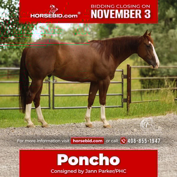 ⚜️𝐓𝐇𝐄 𝐅𝐀𝐋𝐋 𝐇𝐄𝐑𝐈𝐓𝐀𝐆𝐄 𝐂𝐋𝐀𝐒𝐒𝐈𝐂⚜️ Happening now thru MONDAY | NOVEMBER 3rd - Available EXCLUSIVELY on HorseBid's website! For more details and to register visit: www.Horsebid.com CONSIGNOR CONTACT: Jann Parker/PHC 406-855-1947 LOCATION: Billings, MT BREED: quarter Horse REGISTERED: Yes REGISTERED NAME: Smooth Rollz COLOR: Sorrel HEIGHT: 14.1 AGE: 5 GENDER: Gelding Introducing “Smooth Rollz” or Poncho as we call him in the barn. Poncho is a 14.1 hand cute and chromey 5 year old gelding with a kind eye and friendly personality. Poncho is a fancy broke cutting horse and is a joy to take for a nice trail ride! Water crossings? No problem for Poncho! If you’re wanting an excellent all around prospect, poncho is your guy! He is quiet and never gets worked up and is not complicated to ride, show, or just have around the barn! Talk about a flashy and sweet hearted boy to turn heads no matter what you are doing. He is a finished cutting horse with $4,800+ in NCHA lifetime earnings and is ready to go show tomorrow! Poncho has been shown and won money in all levels; open, non pro, and amateur classes and is easy for anyone to get on and go show. He is very easy to keep tuned and sharp for the show pen. If cutting isn’t your interest, Poncho would make an excellent heel horse or breakaway prospect also! Poncho stands great for the farrier and hops right in any trailer. He’s an easy keeper and doesn’t require any maintenance. He is up to date on worming, dental, farrier, and coggins. Don’t miss the opportunity to grab this awesome gelding! If you’re interested in more information about Poncho feel free to reach out! Jann Parker- (406) 855-1947 David Stewart- (405) 818-4343