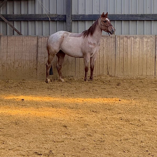 Intent to Hollywood, aka “Woody” 2020 AQHA Red Dun Roan Gelding Intent to Spoon x Cocky Goes Hollywood (Pinewoods King Jac) Woody is a gentle and personable gelding standing approximately 1.45 m (14.1 hh), with a stunning Red Dun Roan coat. With Woody, you have a versatile partner; he is suitable for both recreational riders and more ambitious riders looking to train for competitions. He has been professionally trained in basic cutting and is familiar with working cattle. Woody possesses good cow sense and is not easily spooked. Not only will he excel in cow work, but he is also well-suited for other Western disciplines such as Ranch Riding. He is a horse that is turned out outside every day in a herd (stabled at night) and enjoys playing with his friends. A social and friendly horse, both towards other horses and people. Of course, he has been regularly wormed, vaccinated, and is well-behaved at the farrier. Woody has no stable vices and is in good health. A veterinary examination (pre-purchase inspection) is of course possible. The asking price for Woody is €10,000. Please feel free to contact us with any questions or if you are interested!