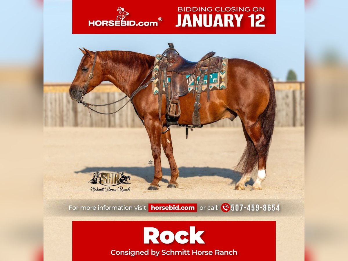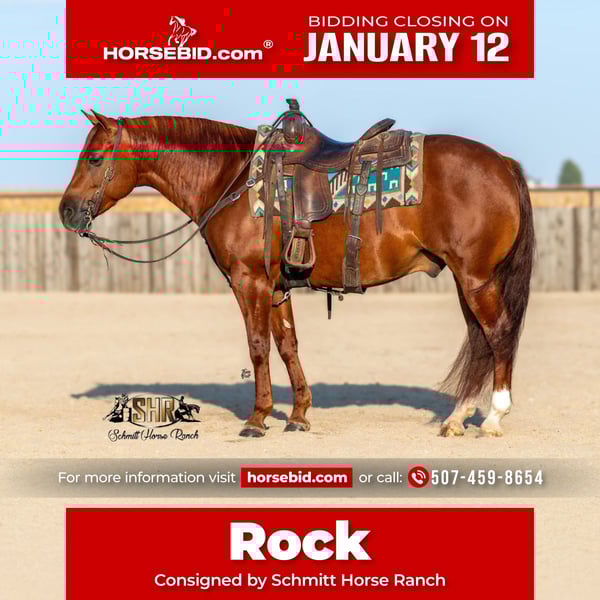 ♦️𝐍𝐄𝐖 𝐘𝐄𝐀𝐑'𝐒 𝑬𝒙𝒕𝒓𝒂𝒗𝒂𝒈𝒂𝒏𝒛𝒂♦️ Happening now thru MONDAY | JANUARY 12th - Available EXCLUSIVELY on HorseBid's website! For more details and to register visit: www.Horsebid.com CONSIGNOR CONTACT: Schmitt Horse Ranch 507-459-8654 LOCATION: Holland, IA BREED: AQHA REGISTERED: Yes REGISTERED NAME: Mobsters At Alcatraz COLOR: Sorrel HEIGHT: 14.2 AGE: 6 GENDER: Gelding “Rock” is a fancy, well-trained, compact-built gelding by SG Frozen Enterprise and out of a daughter of HF Mobster. He stands a correct and square 14.2 hands tall. Rock is fully trained in reining, featuring an easy lead change, stylish and correct spins, and deep, smooth sliding stops. We’ve taken him out to county parks for trail rides and exposed him to a variety of unusual sights and situations. He’s stood at the hitching rail overnight with no issues, loads/unloads, and hauls with ease. This gelding is ready to shine in the ranch show pen with minimal prep, thanks to his strong foundation and responsiveness. With his athletic build and natural ability, he could easily transition into the roping arena whether it’s heading, heeling, breakaway, or calf roping, Rock has the potential to go any direction. He’s a striking cherry red sorrel with roan hairs scattered throughout his body, and he turns heads everywhere he goes. If you’re looking for a talented, versatile gelding with eye appeal and training to match, Rock is the one. We have owned Rock pushing towards a full year, he is absolutely sound, no maintenance, no vices, current on deworming, farrier, vaccinations, coggins, dental, and basic pre purchase exam. Rock is located in Holland, Iowa. We have no problem boarding at no cost within a reasonable timeframe until shipping arrangements can be made. Please call with any additional questions.